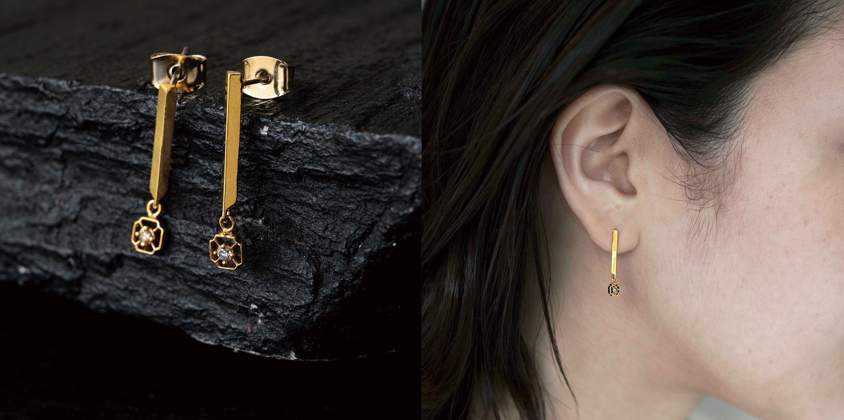 ダイヤモンドを選別する過程で見つかった、ブラウン色入りのダイヤモンド。その美しさに目を向けることで、日常で慈しめるピアスとイヤリングに仕上げています。22金メッキのバーにダイヤモンドが揺れる様が素敵。カジュアルな装いにさりげなくダイヤをまとえます。