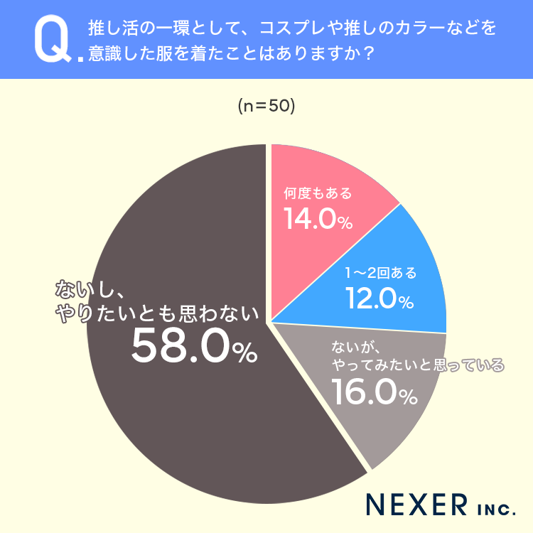 質問1:推し活の一環として、コスプレや推しのカラーなどを意識した服を着たことはありますか?