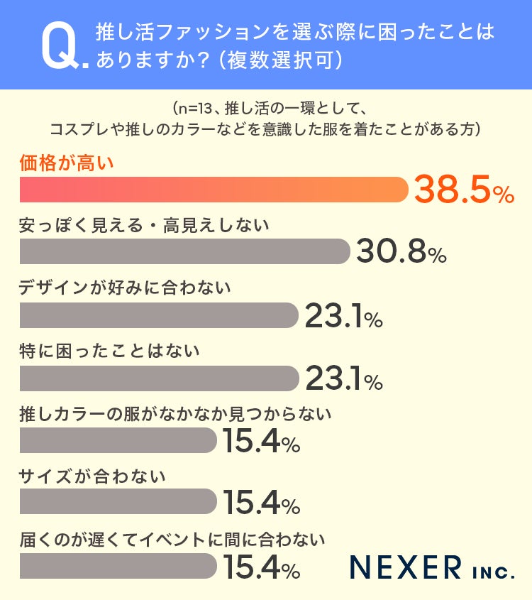 ■推し活ファッション選びで困ったこと、1位は「価格が高い」で38.5%