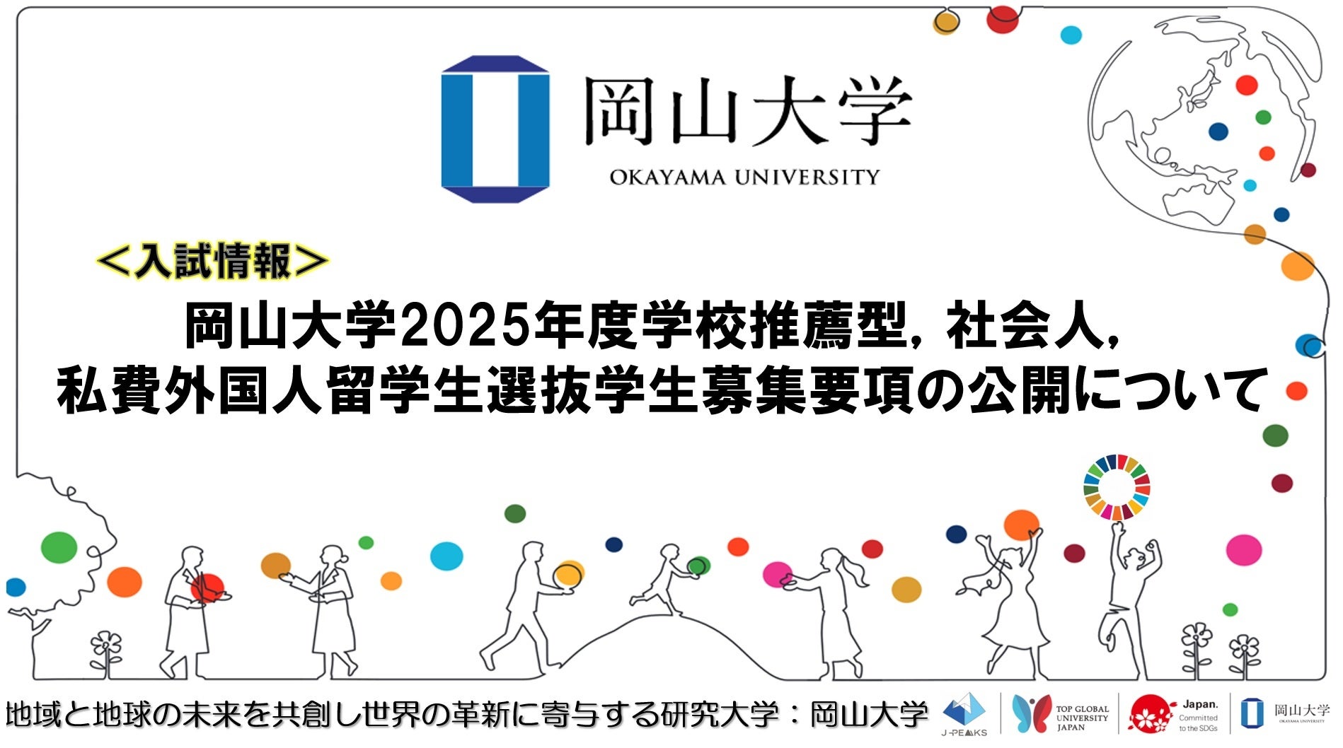 国立大学法人岡山大学(本部:岡山市北区、学長:那須保友)では、「2025年度学校推薦型選抜及び社会人選抜、私費外国人留学生選抜学生募集要項」について、以下の通り公開しましたので、お知らせします。