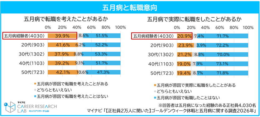 ◆五月病の経験者の約4割が「五月病が理由で転職を考えたことがある」。約2割は五月病が理由で実際に転職を経験