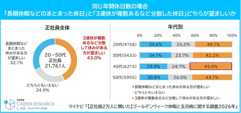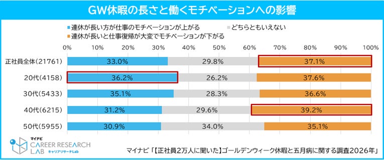 株式会社マイナビ(本社:東京都千代田区、代表取締役 社長執行役員:粟井俊介)は、20~59歳の正社員を対象に実施した「【正社員2万人に聞いた】GW休暇と五月病に関する調査2026年」を発表しました。