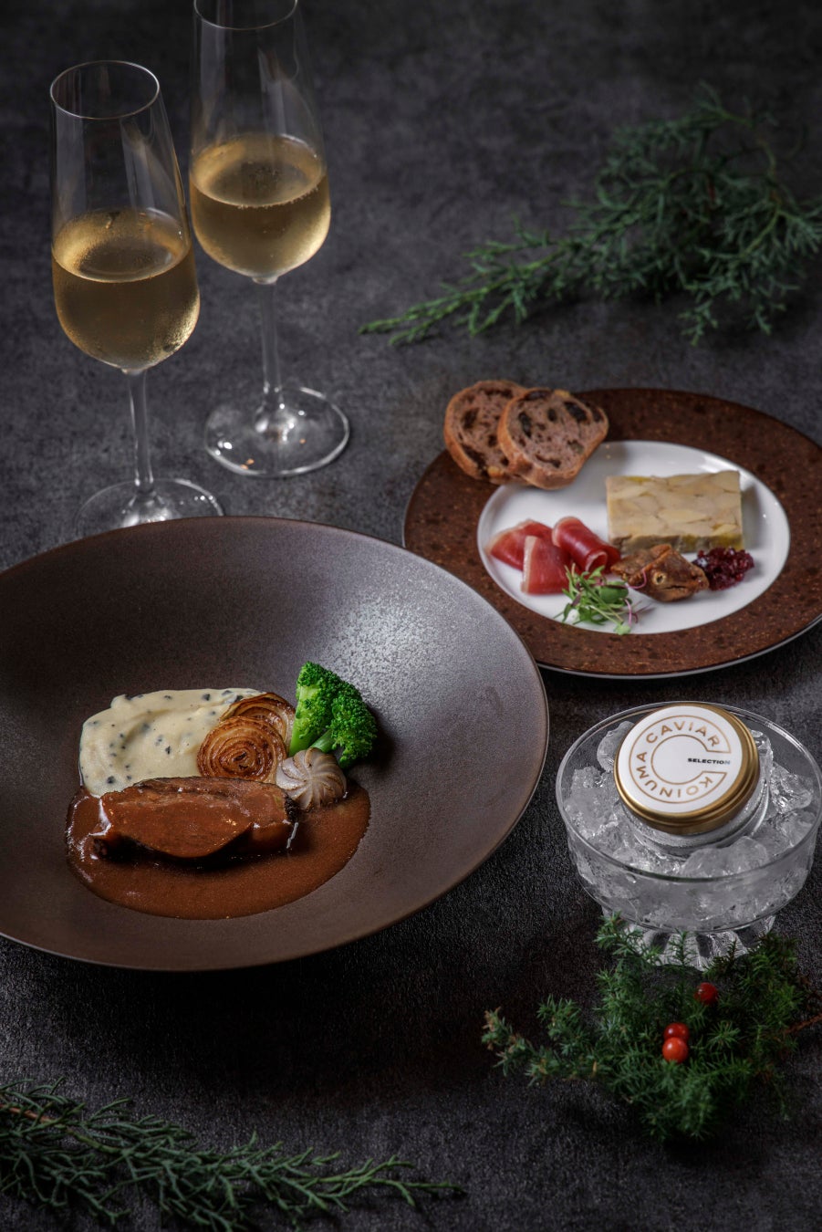 スカイバー「エスカリエ」では、カジュアルでありながら贅沢な味わいに満ちたクリスマス限定メニューをご用意いたします。フォアグラのテリーヌとカモの生ハムを美しく盛り合わせたアペタイザー、そして赤ワインで丁寧に煮込んだ恵比寿牛のブルギニヨンに、トリュフが香るマッシュポテトを添えた一皿。ひと口ごとに、心がほどけるような幸福感が広がります。さらに、キャビアを加えたプレミアムセットもご提供いたします。洗練された空間で、グラスを片手に聖夜の余韻をゆったりとご堪能ください。