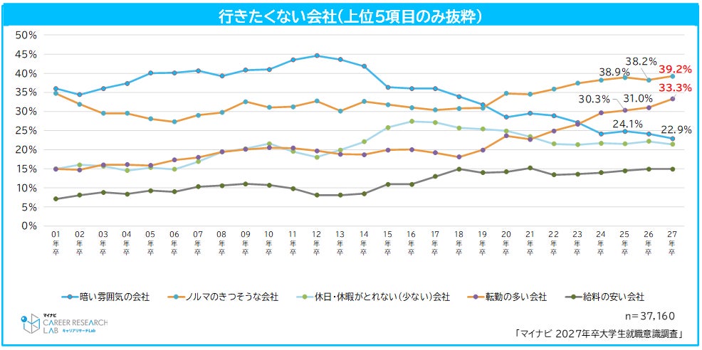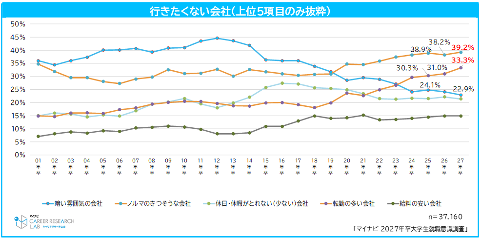 ◆学生が行きたくない会社では、「ノルマのきつそうな会社」が最多。2番目に回答が多い「転勤の多い会社」は6年連続増加