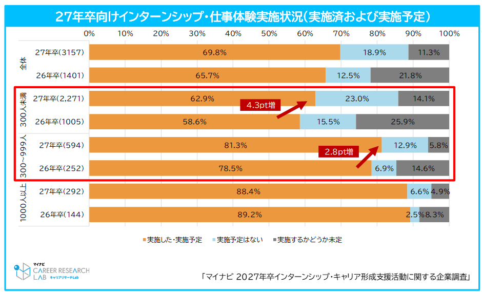 ◆学生の中小企業志向が2年連続増加。インターンシップ・仕事体験実施率の上昇が背景か