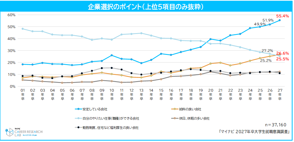 2027年卒業予定の学生に、企業を選択する際にどのような企業がよいか(あてはまる項目を2つまで選択)を聞いたところ、「安定している会社(55.4%/前年比3.5pt増)」が8年連続で最多となった。また、「給料の良い会社(26.6%/前年比1.4pt増)」も5年連続で増加し、前年度まで2番目に多かった「自分のやりたい仕事(職種)ができる会社(25.5%)」を初めて※1上回った。近年の物価高などの経済的な不安から、学生の安定志向と待遇面への関心が高まっている可能性がある。【図1】