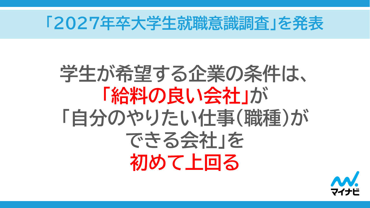 株式会社マイナビ(本社:東京都千代田区、代表取締役 社長執行役員:粟井俊介)は、2027 年卒業予定の全国の大学生、大学院生を対象に実施した、「2027年卒大学生就職意識調査」の結果を発表しました。