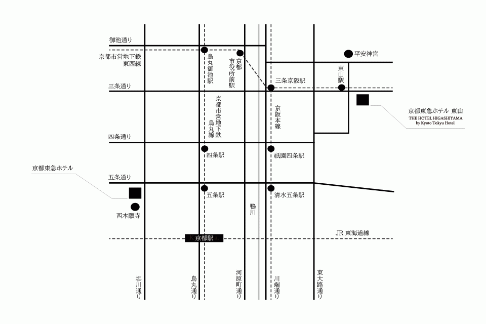 京都東急ホテル東山は京都の中でも文化・芸術施設が多く集積する東山・白川エリアに位置し、ホテル周辺には京都市京セラ美術館や京都近代美術館、ロームシアター京都などの文化施設、また平安神宮、青蓮院門跡、知恩院をはじめとした寺社仏閣なども数多く点在しております。文化・芸術施設へは徒歩圏内とアクセスが便利なため、京都の新しい滞在拠点としてお使いいただけるホテルです。