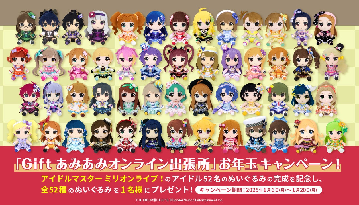 ① アイドルマスター ミリオンライブ!のアイドル52名のぬいぐるみの完成を記念し、『「Gift あみあみオンライン出張所」お年玉キャンペーン』を開催。