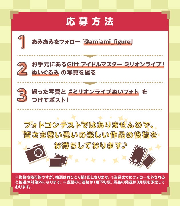 ② X(旧Twitter)あみあみアカウント(@amiami_figure)をフォロー、お手元にある「Gift アイドルマスター ミリオンライブ! ぬいぐるみ」を撮影し、「#ミリオンライブぬいフォト」をつけてポスト!抽選で1名様に、Gift アイドルマスター ミリオンライブ! ぬいぐるみ 全52種を1セットにしてプレゼント。
