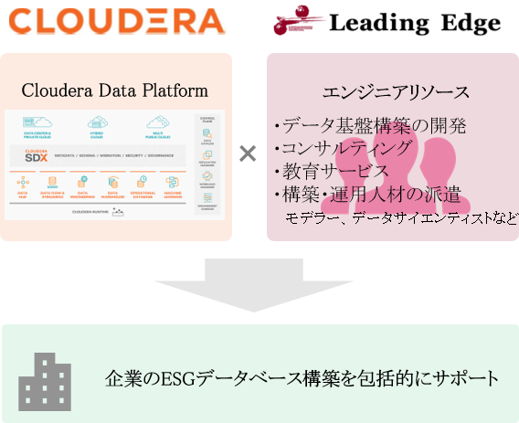 CDPは、容易にデータの収集や分析ができ、AI(人工知能)/ML(機械学習)の活用までを完結できるビッグデータ統合プラットフォームです。今回の業務提携では、ClouderaがCDPを提供し、LE社がESGデータ基盤を構築・運用するための開発やコンサルティング、教育、人材の派遣などのエンジニアリソースを提供いたします。本サービスにより、企業はCDP Public Cloud を使用し、モデラーを含むデータサイエンティストの派遣やコンサルティング、教育サービスを受けながら、日本向けのAI/MLプロダクトを開発することが可能になります。