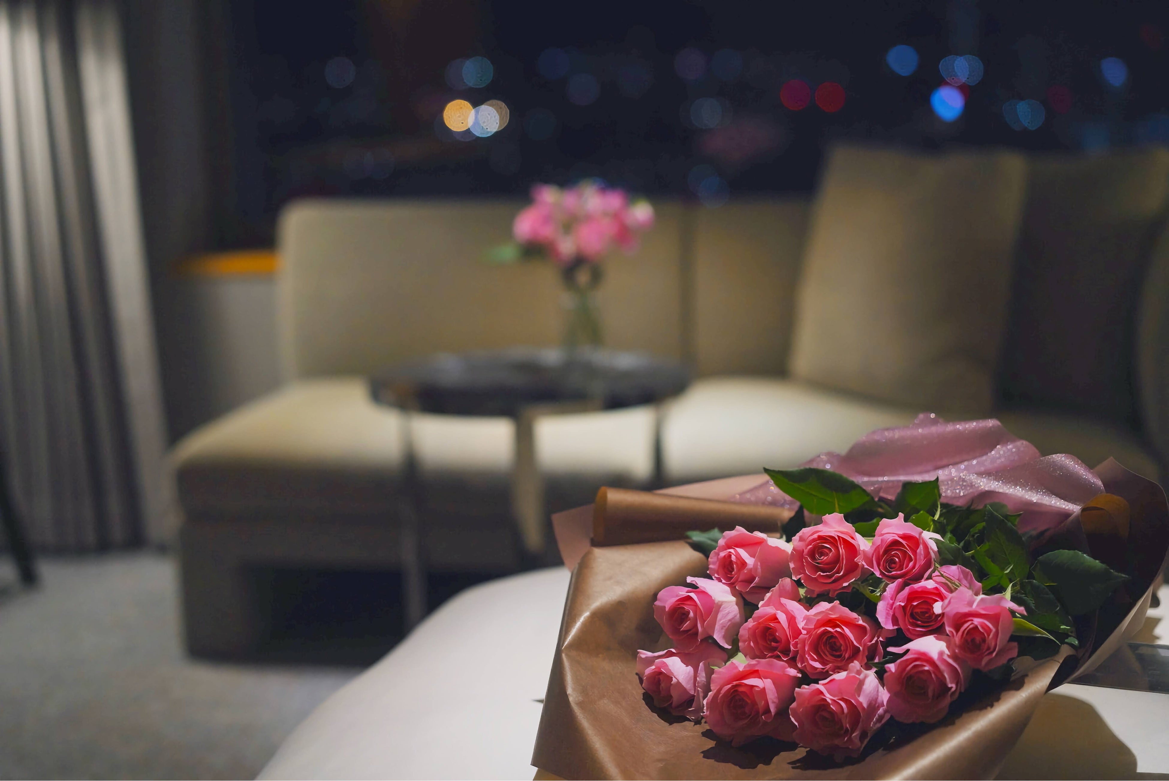 ・内容:ダズンローズブーケをお部屋にご用意、室内装花(窓辺とパウダールーム)