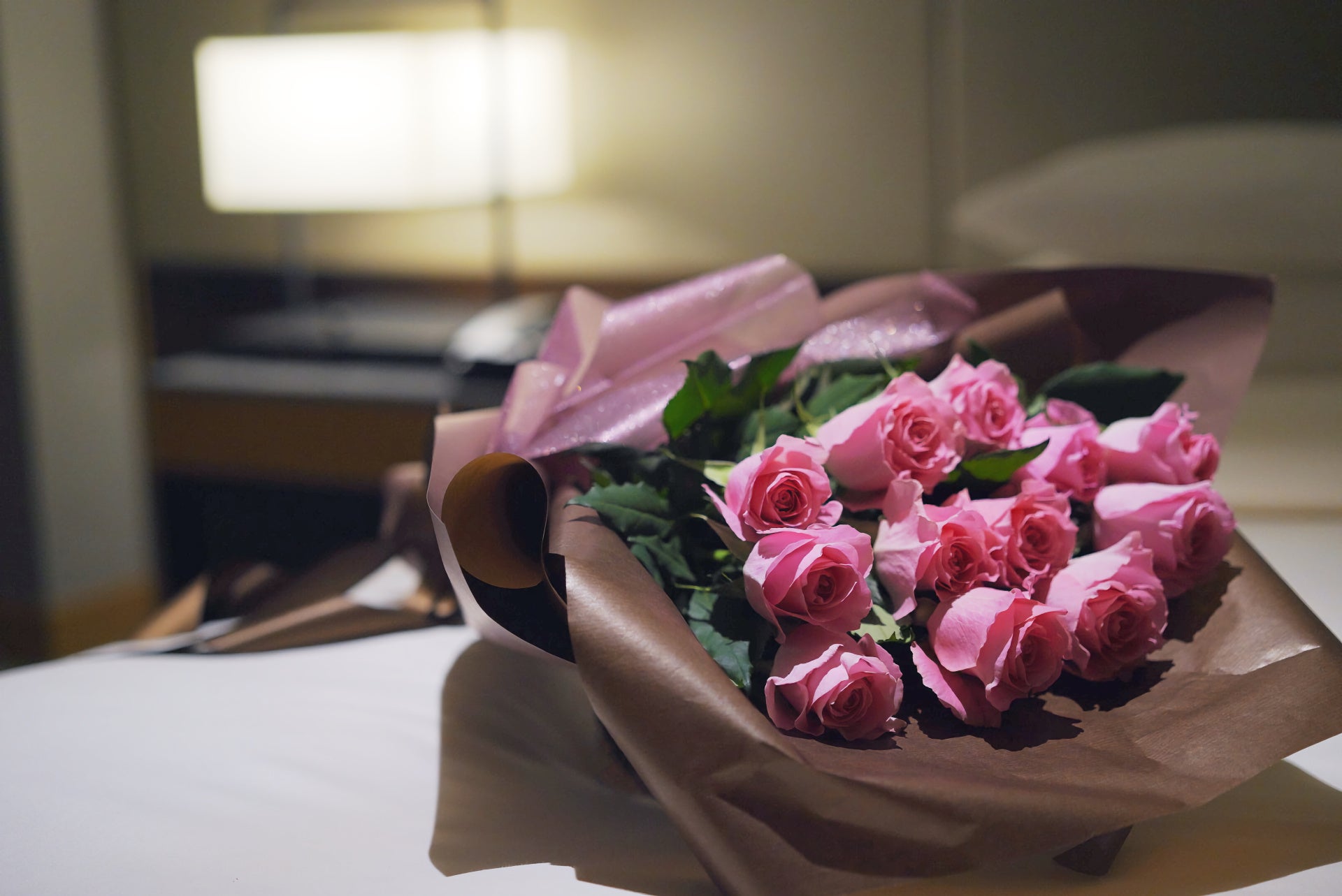 客室内をバラやスイートピーなどの香り華やかな花々で彩り、ロマンティックな意味を持つ特別なブーケ「ダズンローズ」をご用意いたします。