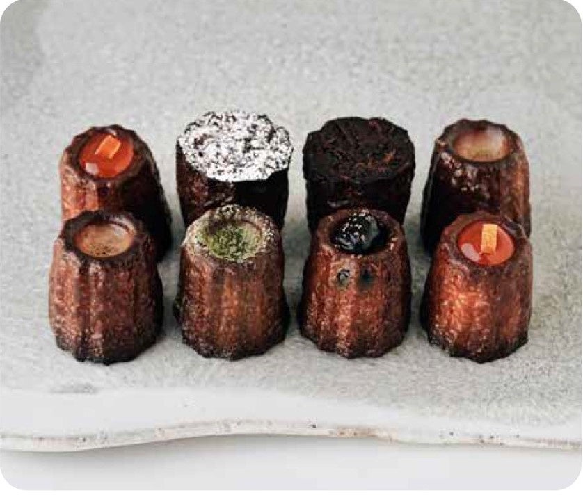 外はカリッと、中はもっちり。手のひらサイズの小さなカヌレは日本の食材と四季を重ね合わせたカヌレの専門店から。お好きなカヌレを1個からお選びいただけるほか、8種のアソートボックスもご用意。