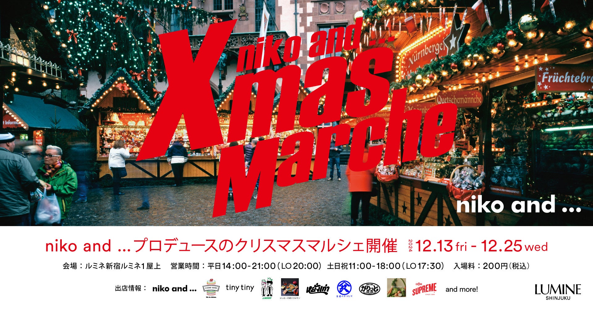 「Play fashion!」をミッションに掲げ、”グッドコミュニティ共創カンパニー” を目指す株式会社アダストリア(本部:東京都渋谷区渋谷2-21-1、代表取締役社長:木村 治)が展開するスタイルエディトリアルブランド「niko and ... (ニコアンド)」がキュレーターとなり、ブランドとして初めての「niko and ... Xmas Marche(ニコアンドクリスマスマルシェ)」を開催いたします。開催場所となるルミネ新宿ルミネ1の屋上スペースには、「niko and ...」に所縁のあるさまざまなショップが30以上集結し、フードやドリンク、ファッション、雑貨の販売や、アーティストライブ、ワークショップといったクリスマスムード溢れるイベントが催され、2024年12月13日(金)~ 25日(水)までの期間限定で都心のお出かけスポットを特別演出します。