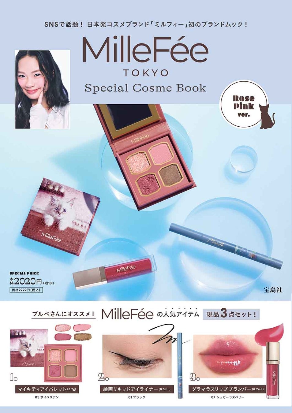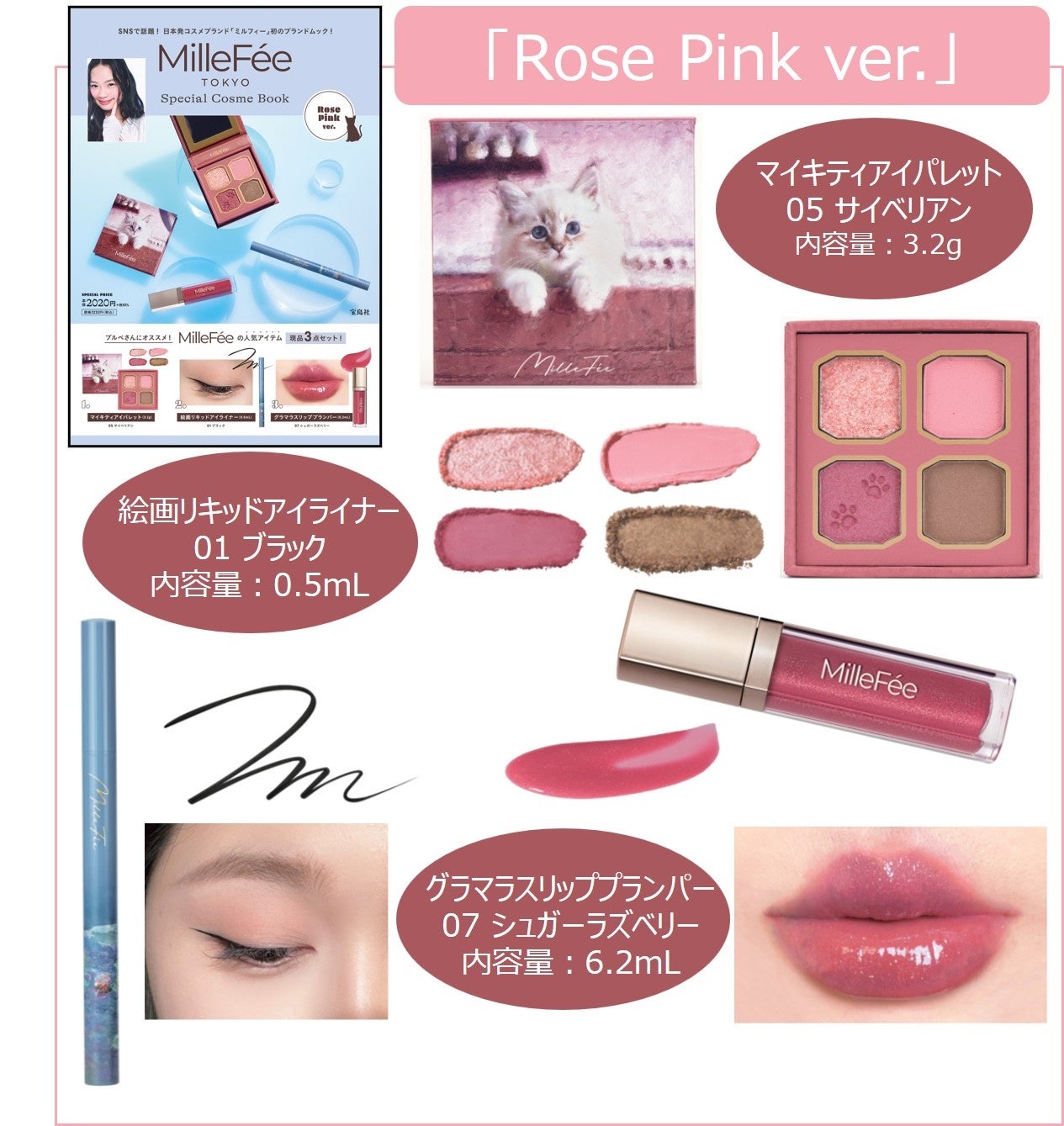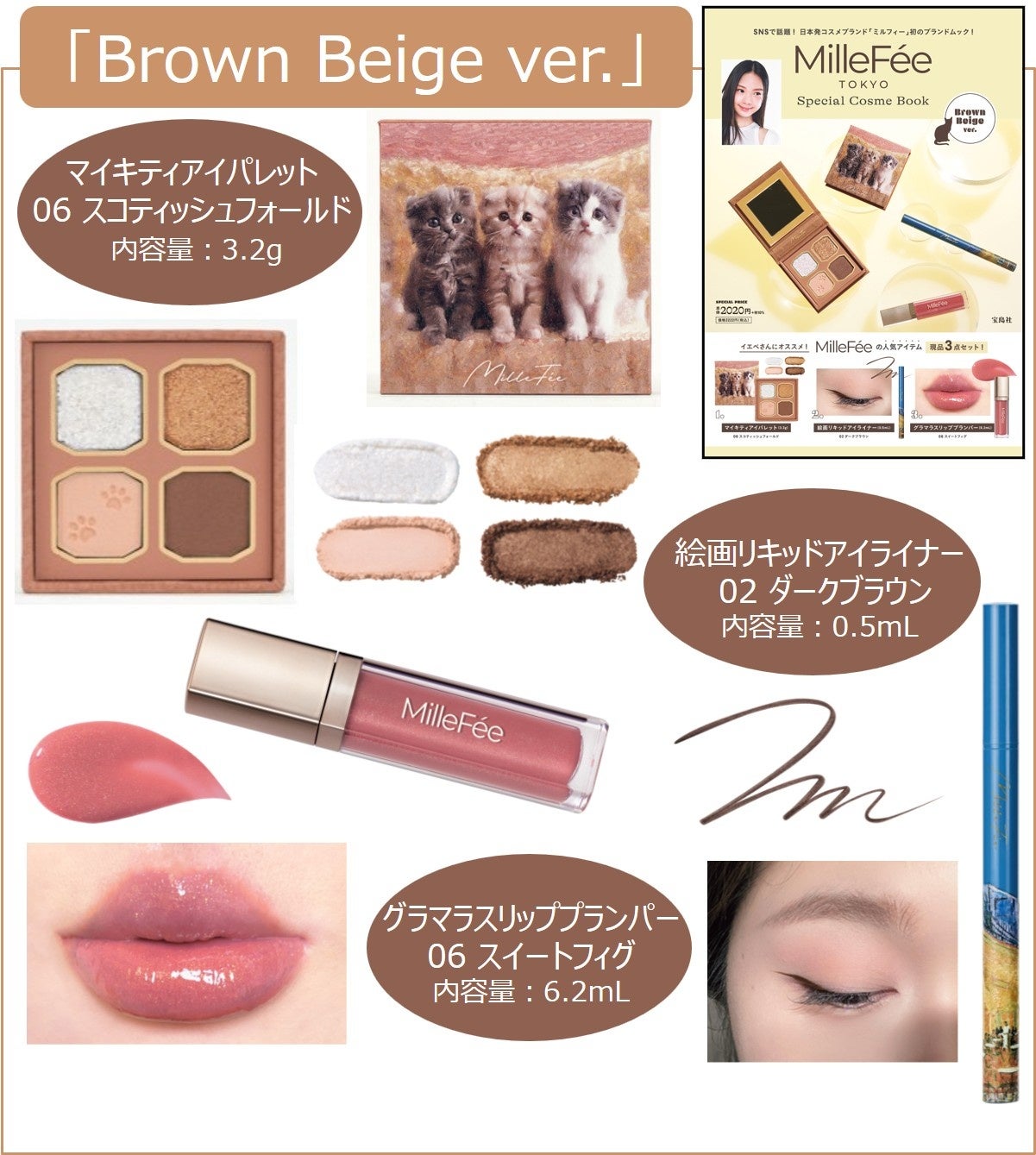 「MilleFée(ミルフィー)」からは、猫シリーズのマイキティアイパレット、絵画シリーズのアイライナー、リップシリーズのグラマラスリッププランパーの3点が付録のブランドムックが登場。誌面ではこれらを使ったメイクを紹介。「Brown Beige ver.」と「Rose Pink ver.」の2種同時発売で、価格はアイパレットのモチーフ猫にちなんで、2222円(税込)となっています。