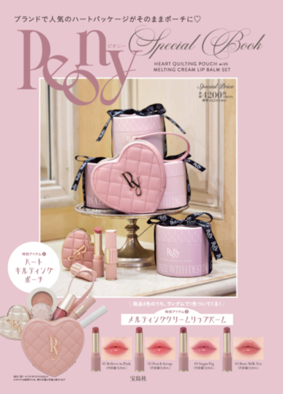 最後は、ハートのパッケージが話題のライフスタイルブランド「Peony(ピオニー)」初のブランドムック『Peony Special Book』。5月2日(土)に発売します。SNSで度々話題にあがるハートパッケージをモチーフにした本誌限定ポーチと、人気の「メルティングクリームリップバーム」の現品がランダムで1色ついてくるスペシャルな内容となっています。