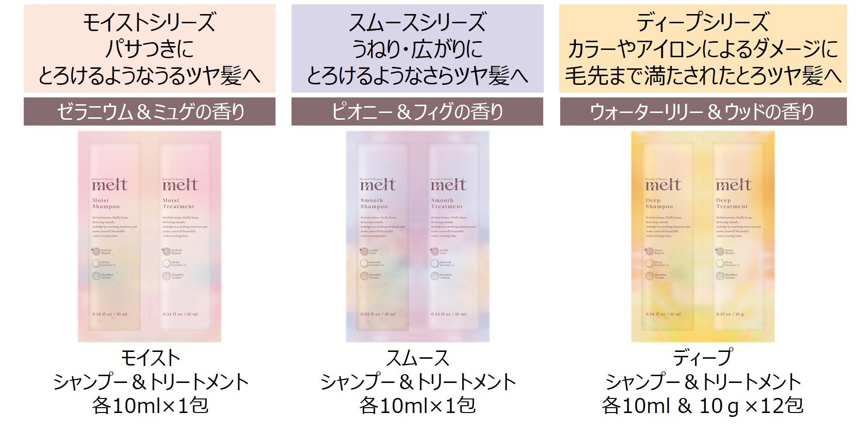 今回は、この春新発売したダメージ髪向けの「ディープ」や、リニューアル後SNSで話題沸騰中の生炭酸(※1)パウダーも試せる豪華43点セットです。シャンプー&トリートメントとコンディショニングウォーターが3種試せる贅沢な詰め合わせ。インバスからアウトバスまで❝自分に合う❞を見つけられる3種の香りと仕上がりを体感できます。心地よく満たされる香りに包まれながら美容タイムを楽しんで。