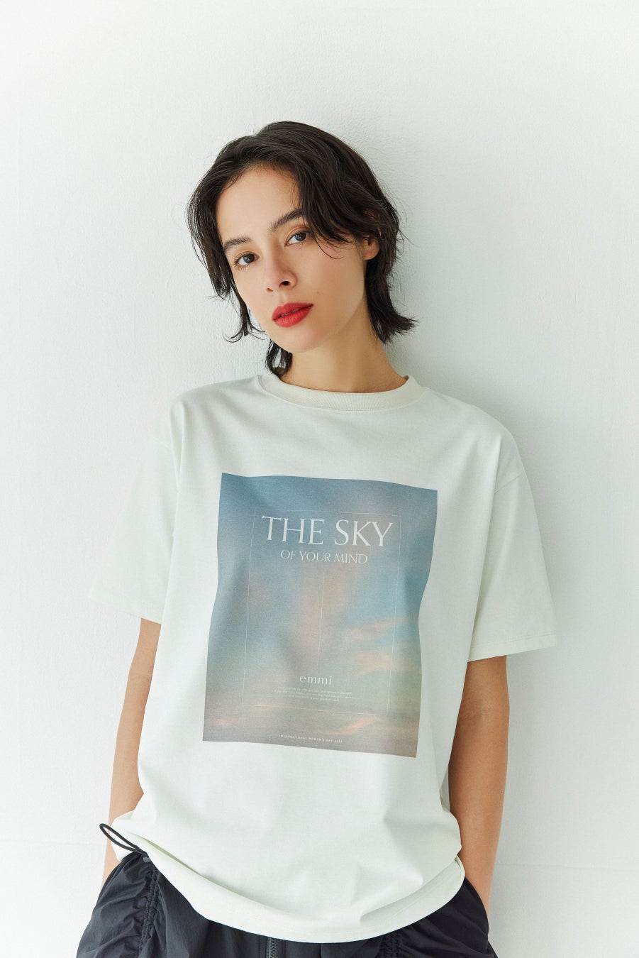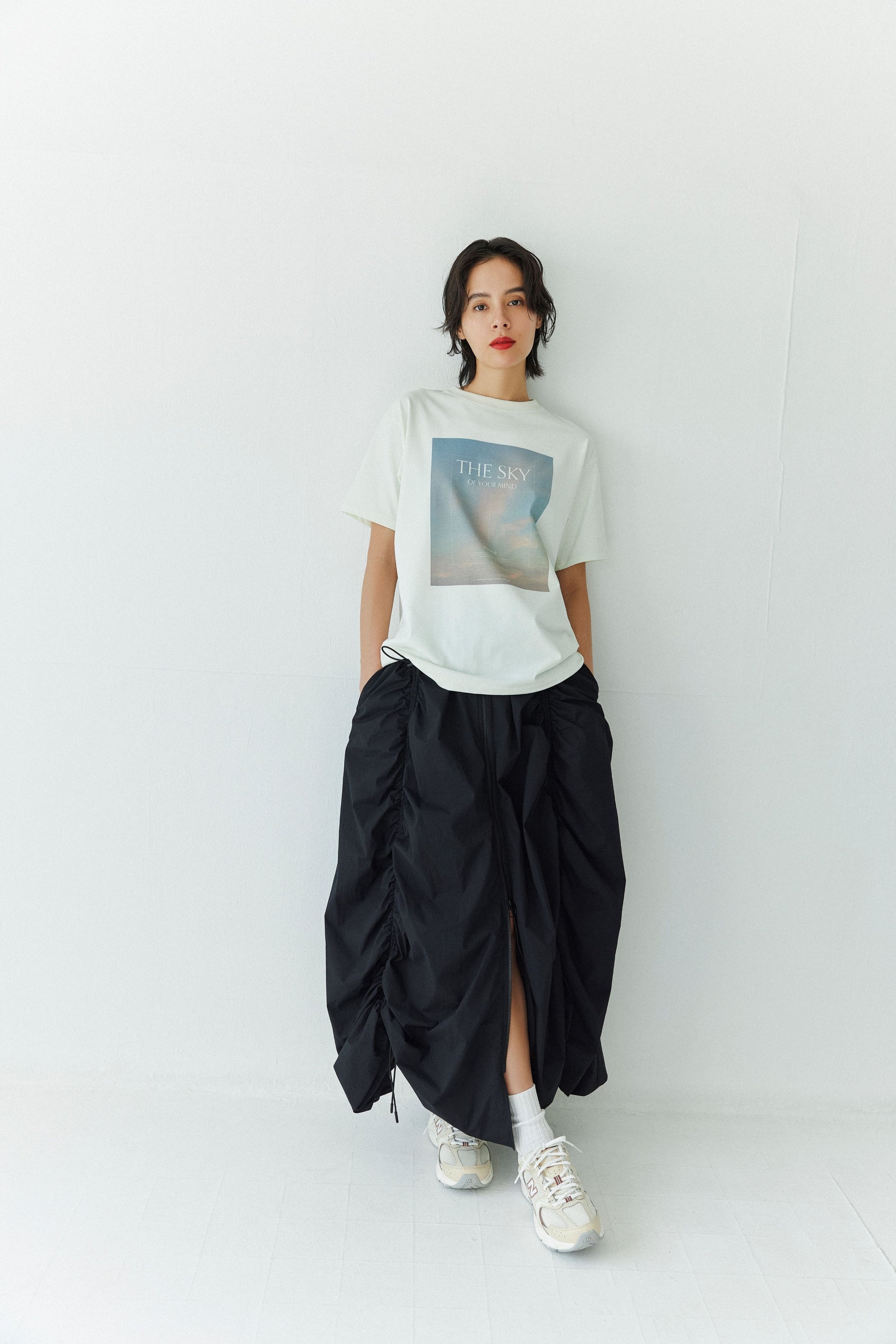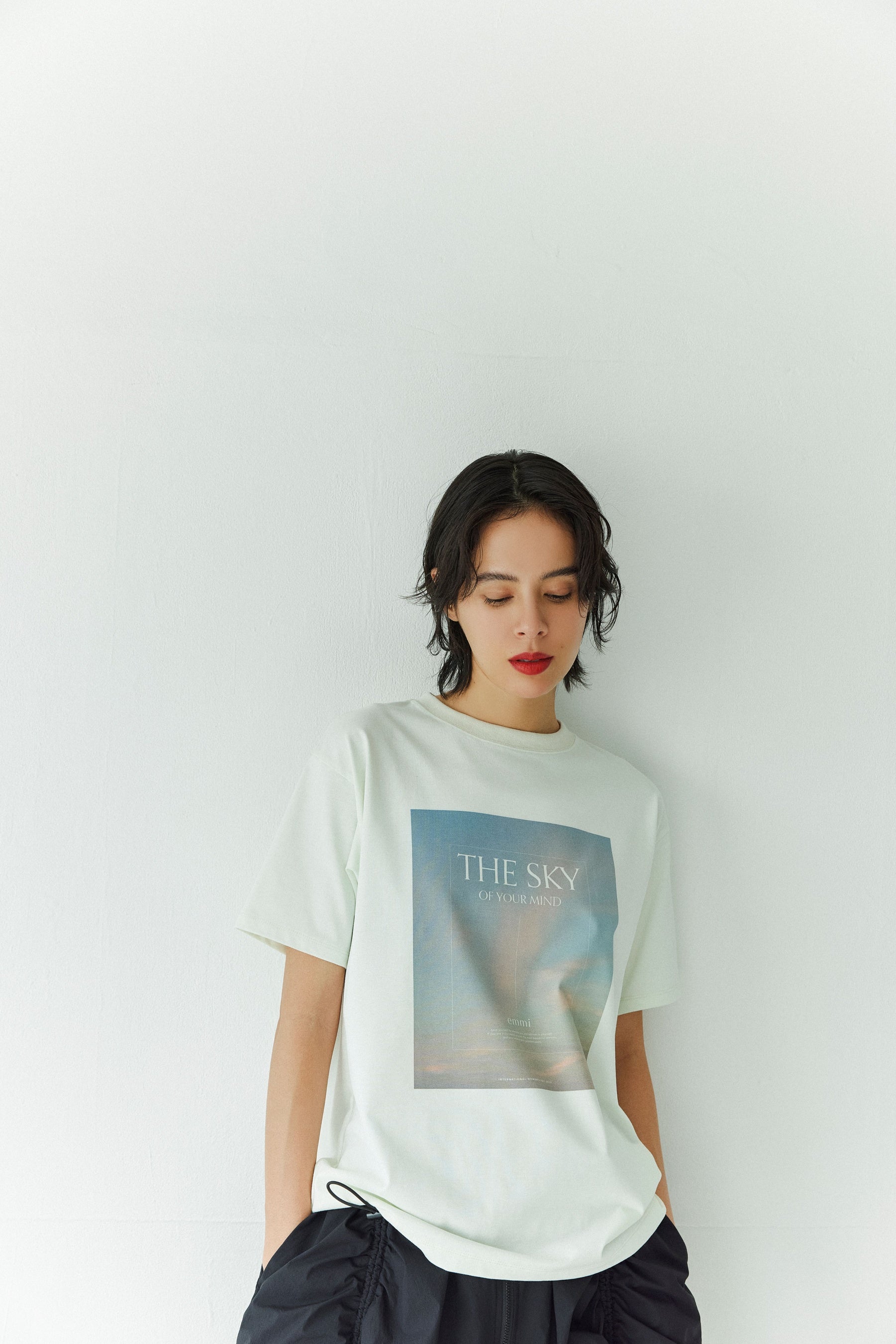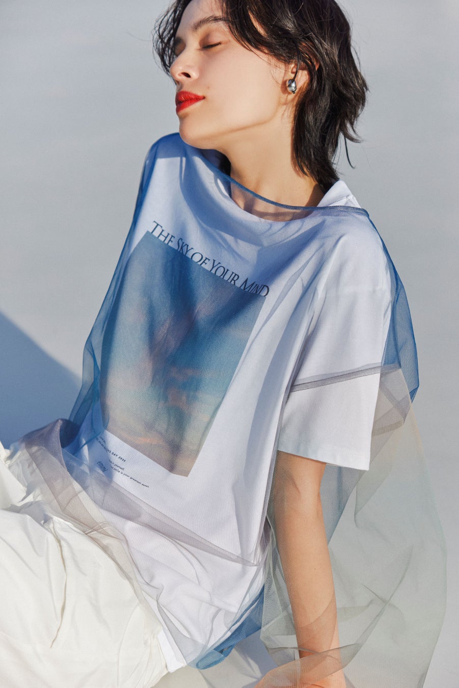 デイリーに使いやすいフォトプリントのTシャツ2型とトートバッグ、そしてカットソーなどのトップスに重ねて遊びたいチュールトップスには空の写真を転写しました。