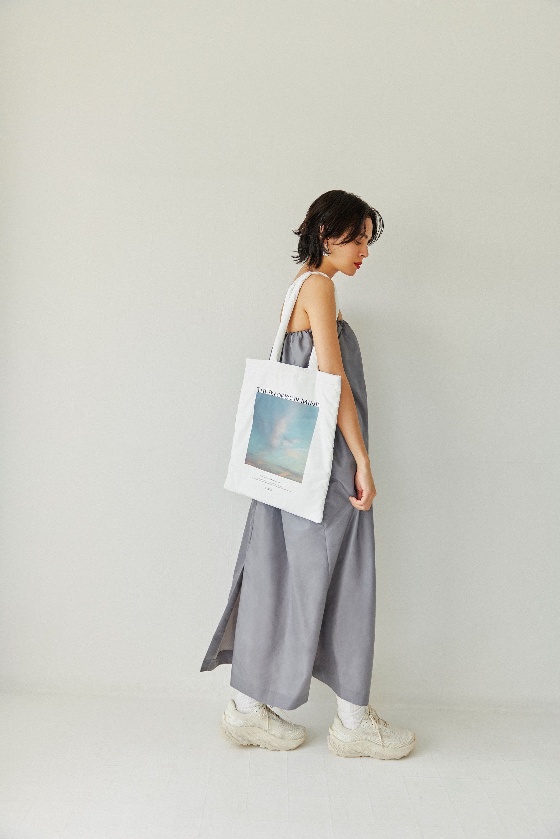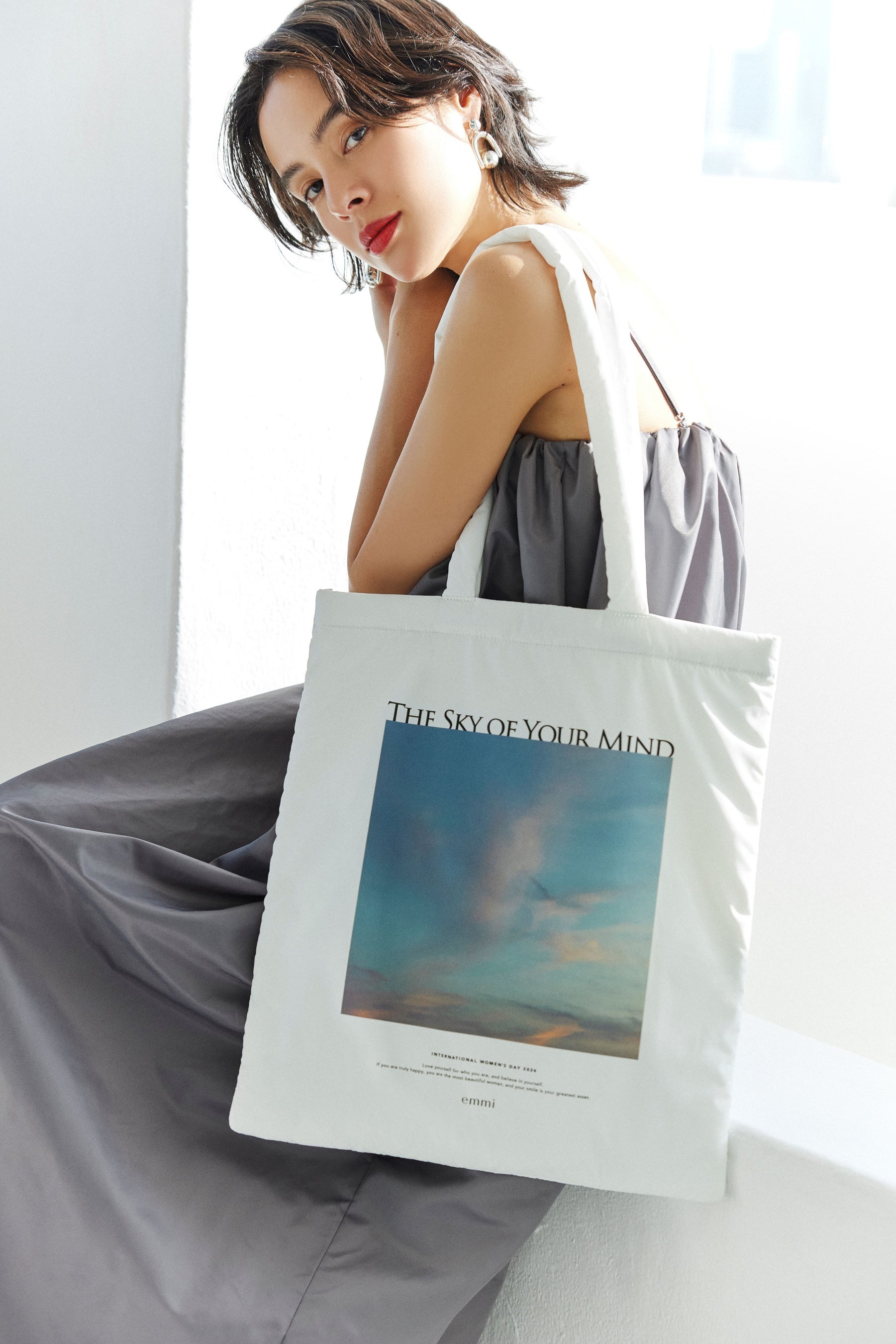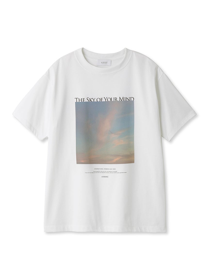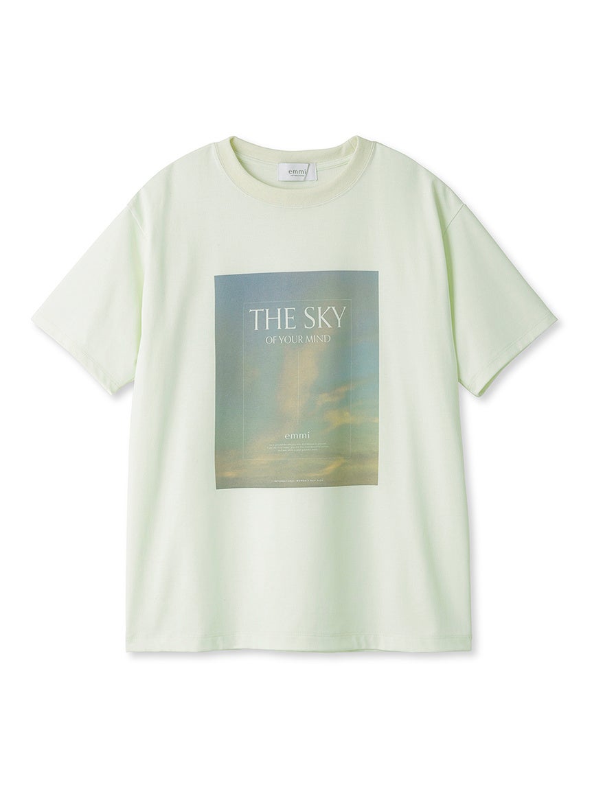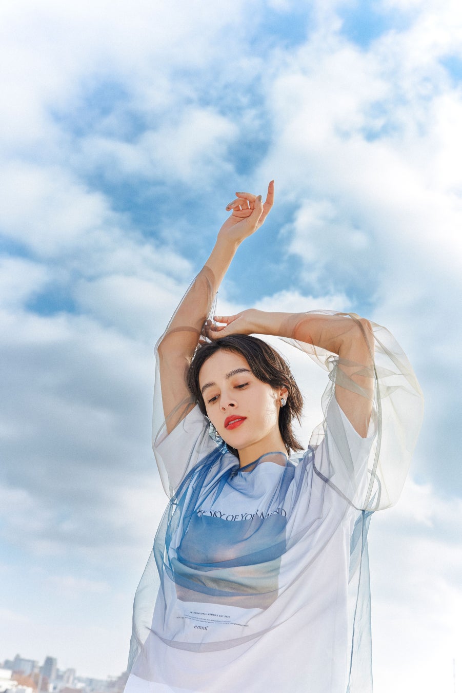 デイリーに使いやすいフォトプリントのTシャツ2型とトートバッグ、そしてカットソーなどのトップスに重ねて遊びたいチュールトップスには空の写真を転写しました。