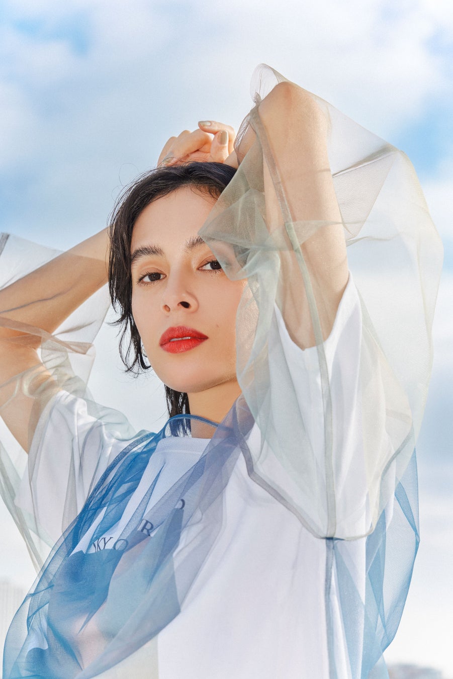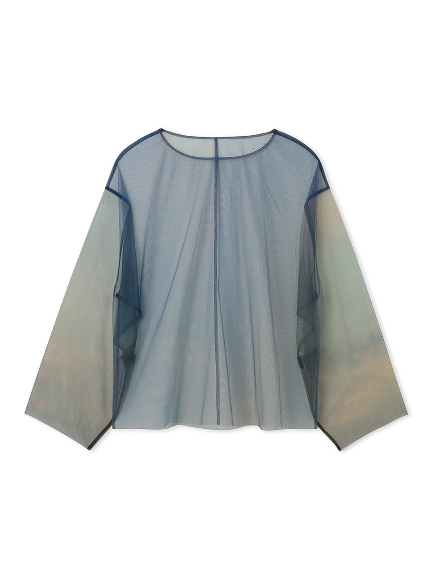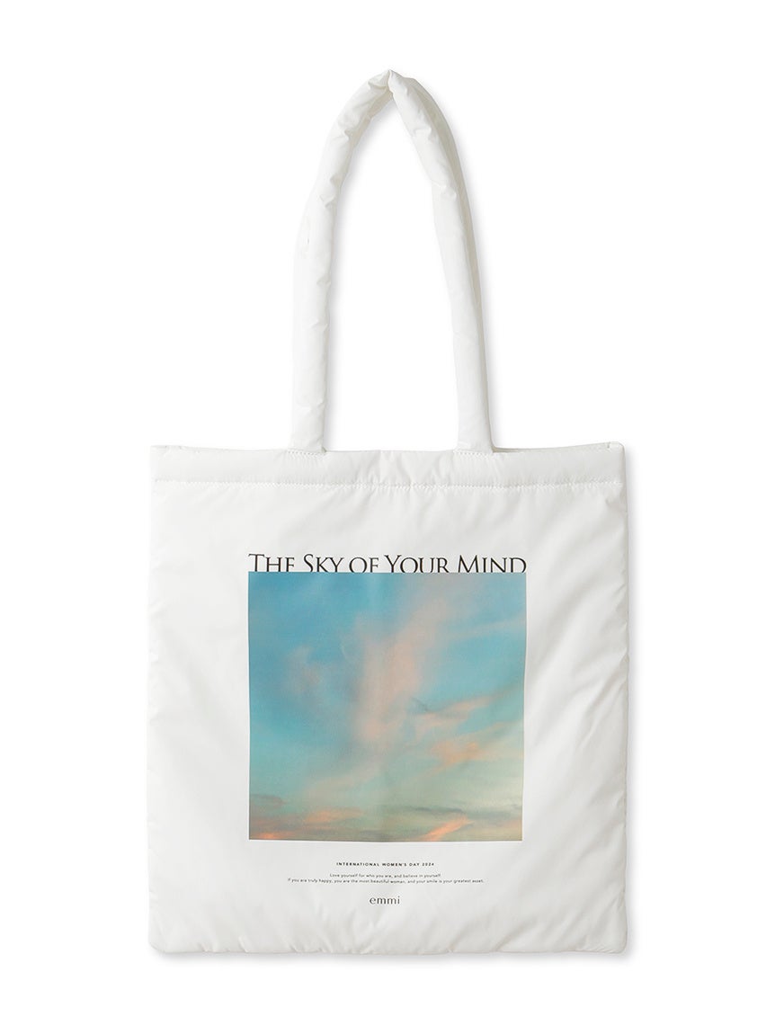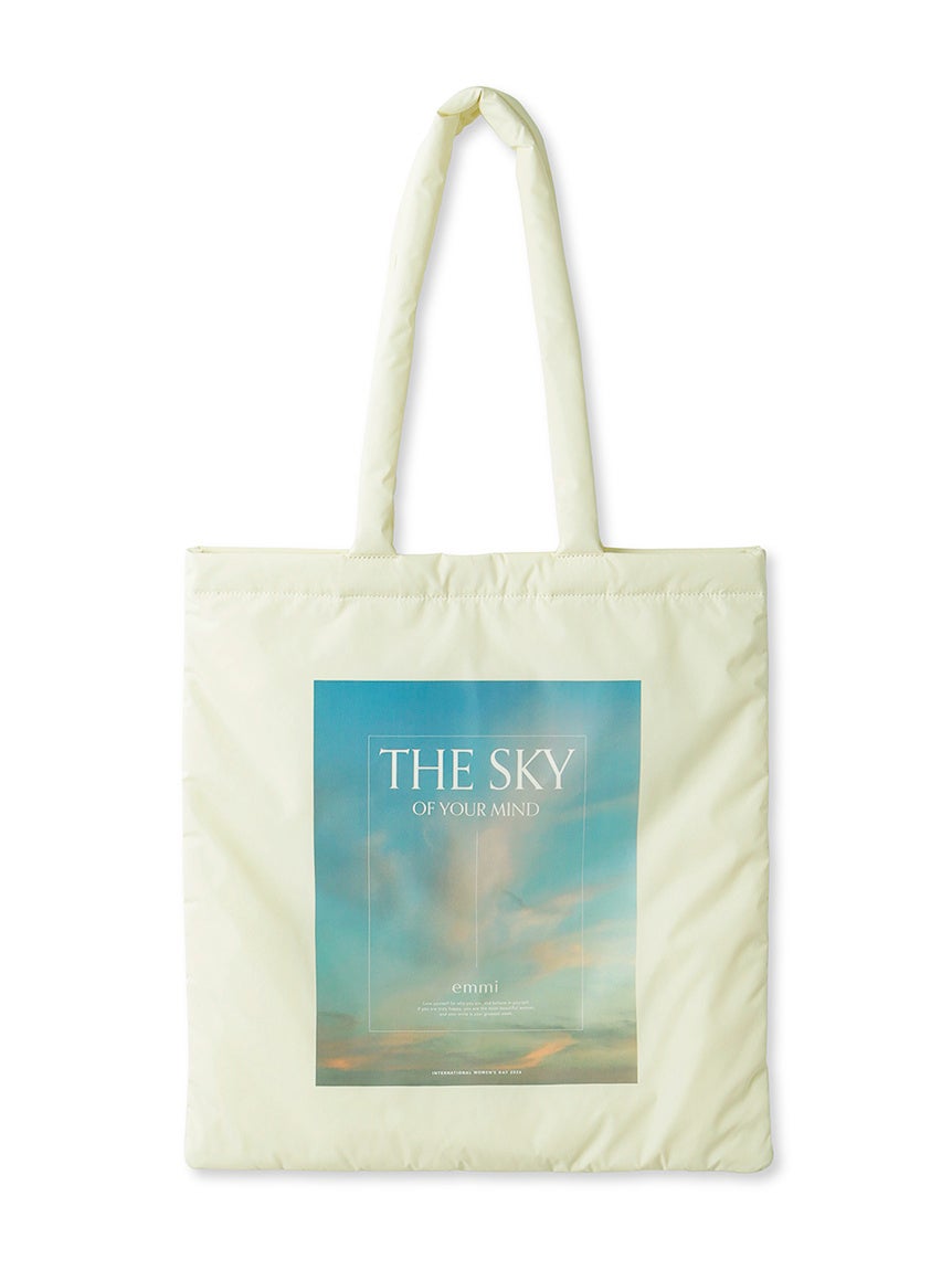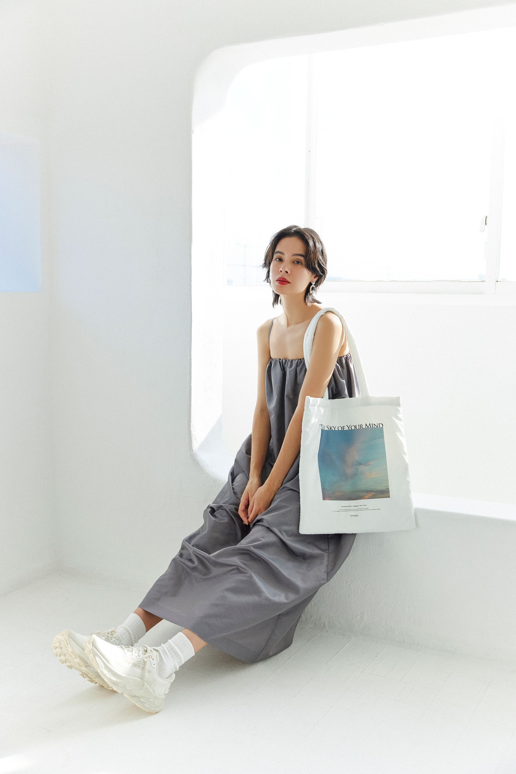 デイリーに使いやすいフォトプリントのTシャツ2型とトートバッグ、そしてカットソーなどのトップスに重ねて遊びたいチュールトップスには空の写真を転写しました。
