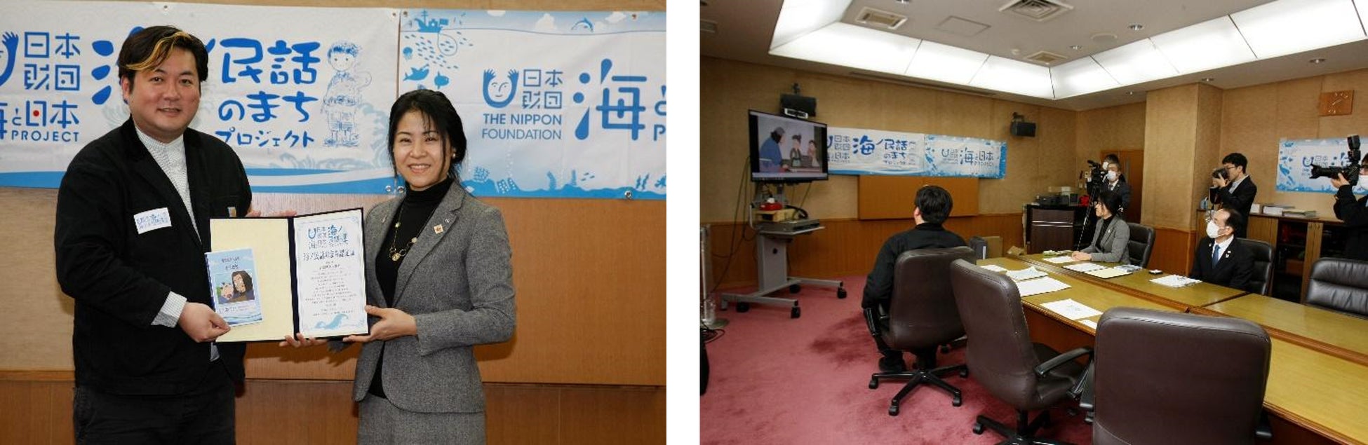 プログラム | ●司会挨拶 ●海ノ民話のまちプロジェクト説明 ●「海ノ民話のまち」認定証・完成アニメパッケージ贈呈 ●フォトセッション ●海ノ民話アニメーション上映 ●会談 ・感想などフリートーク ・上映会とフィールドワークの予定 ・活用、展開についてフリートーク ●取材(首長) ・海ノ民話アニメーションの感想 ・地域における活用構想など ●取材(沼田監督) ・今回の作品に対する想い ・地域の皆様へのメッセージ ●個別取材 |