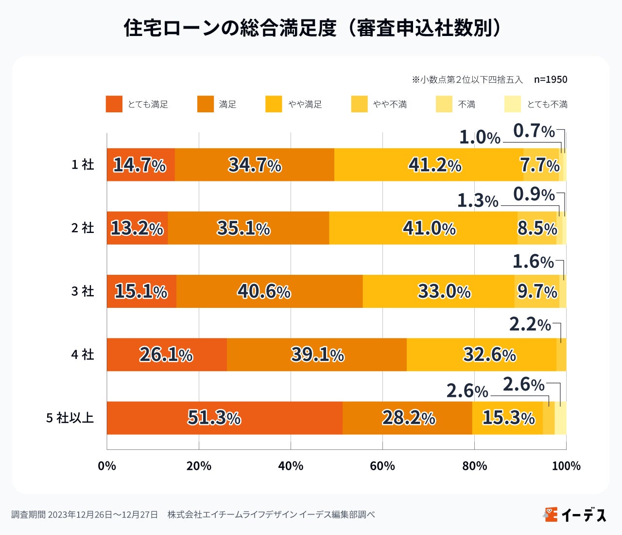 今回の調査で、5社以上に審査を申し込んだ人の過半数が利用中の住宅ローンに対して「とても満足」と回答しました。