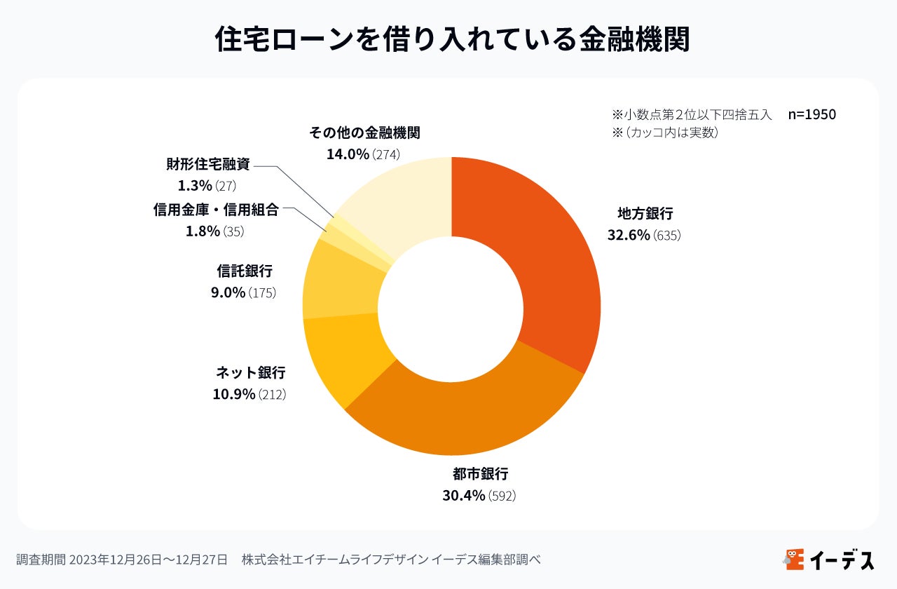 住信SBIネット銀行やauじぶん銀行のようなネット銀行、JAバンクやろうきんのような金融機関利用者も比較的多く、住宅ローンを利用するうえで金融機関の選択肢は多種多様のようです。