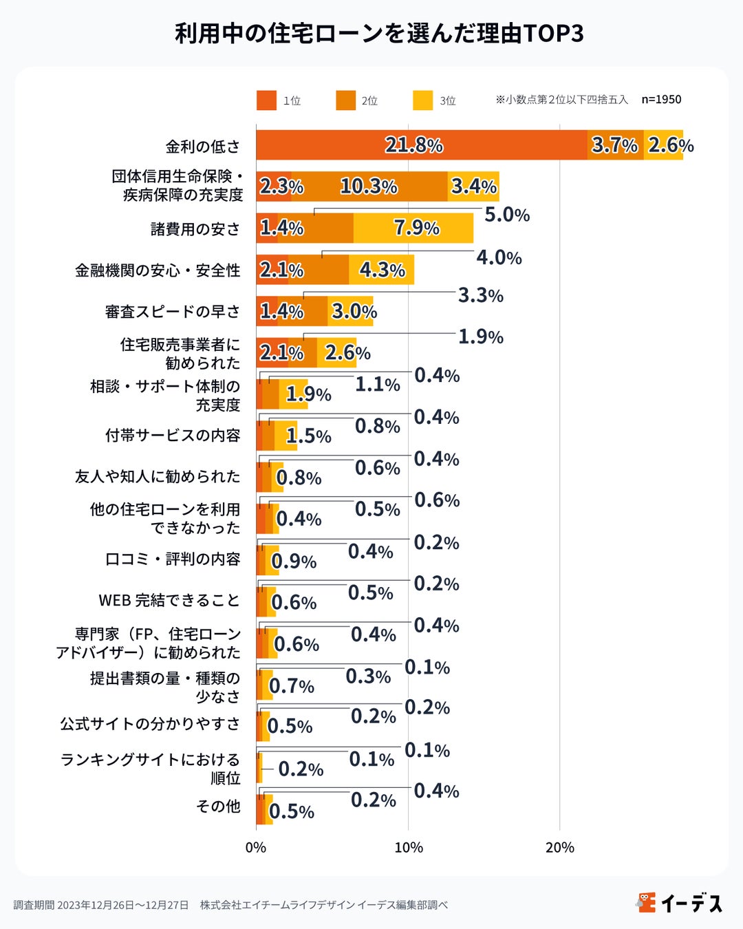 また、利用中の住宅ローンを選んだ理由のTOP3についても聞いたところ、「金利の低さ」の次に重視されているのは「団体信用生命保険・疾病保障の充実度」であることがわかりました。