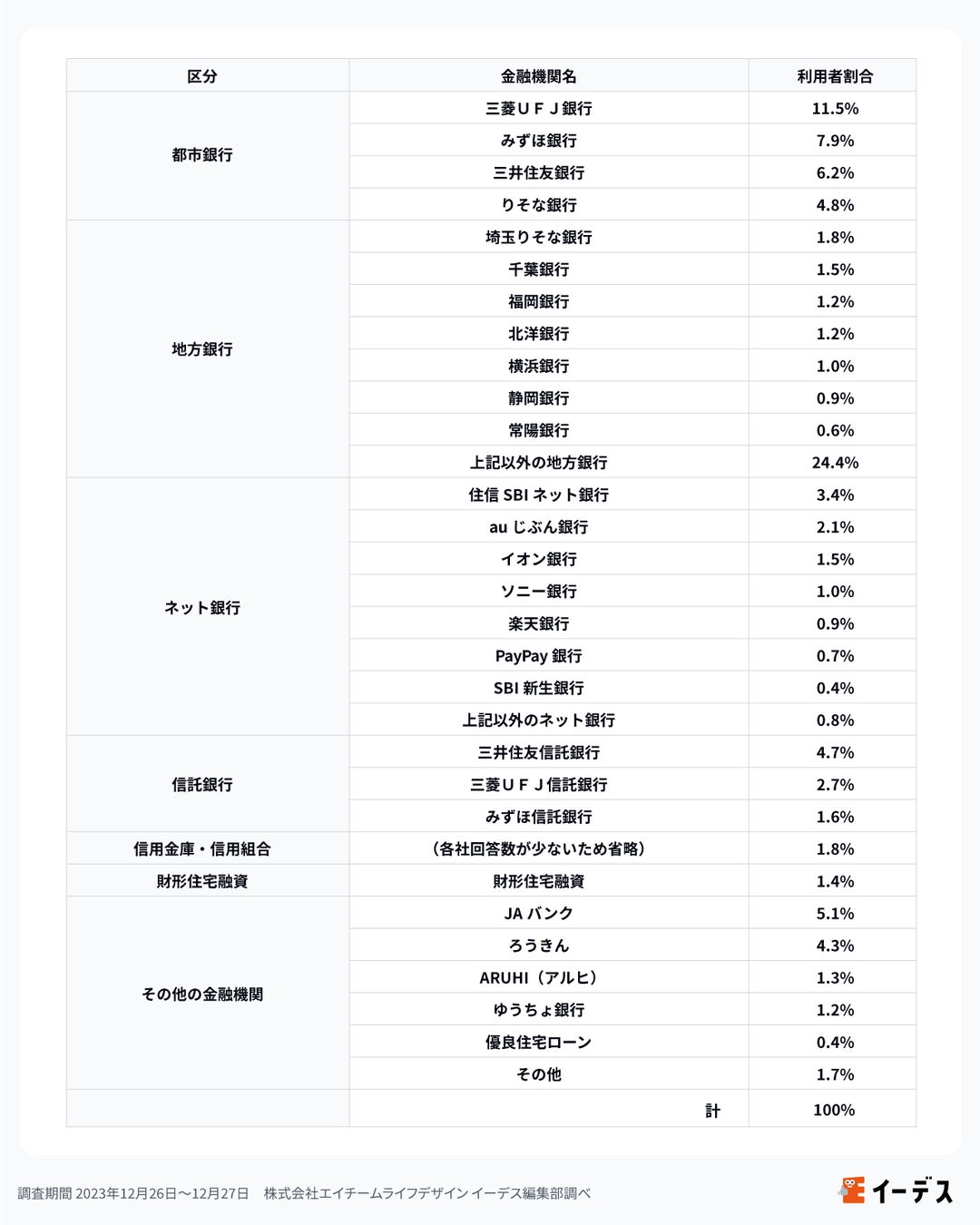 住宅ローンの借入先として最も多い金融機関は三菱UFJ銀行で11.5%