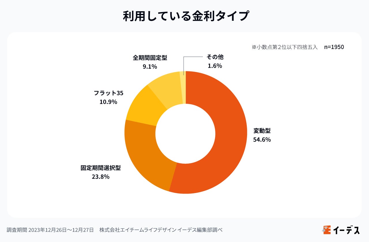 利用している住宅ローンの金利タイプを質問したところ、変動型が過半数で54.6%、次いで固定期間選択型が23.8%、フラット35が10.9%、全期間固定型が9.1%という結果になりました。