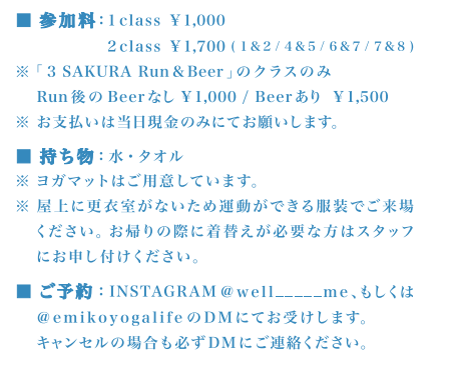 Well-Me 11: 00~(1日:5クラス/2日:3クラス各45分~90分) 要予約/参加料 ¥1,000~