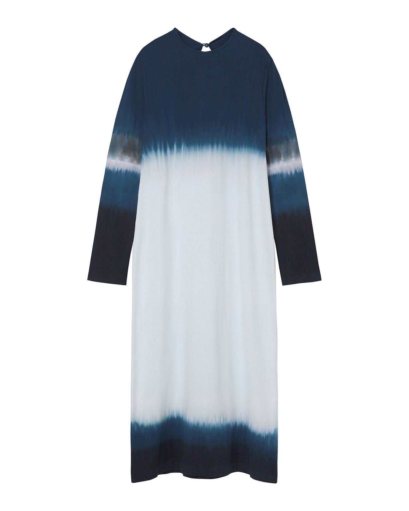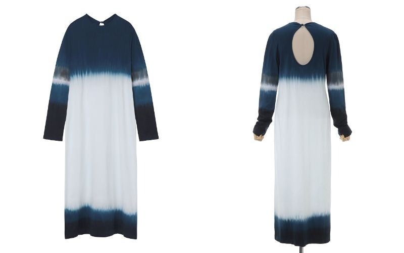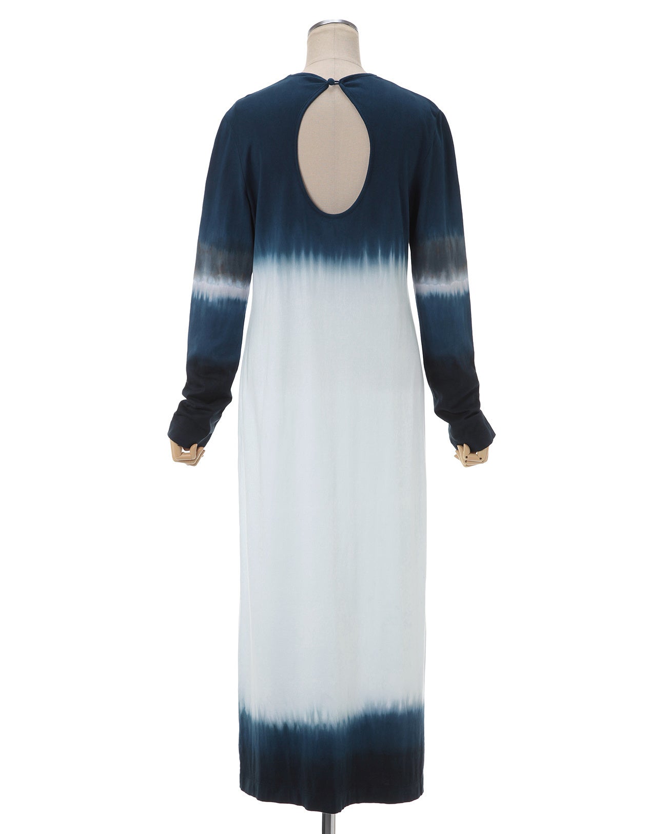 繊細に染め上げたグラデーションが印象的なジャージードレス。伊勢丹新宿店限定として今季のキーアイテムからネイビーカラーのグラデーションが登場します。柔らかで上質なぬめり感を持つコットンを使用し編みたてたジャージー生地は、自然な光沢感と優しいタッチで上品な印象。絞り染めにより鮮やかなグラデーションに染め上げたドレスはバスト周りや腕まわりが華奢に見えるように設計されており、大胆なオープンバックがフロントとのギャップを生み出し、センシュアルな印象を演出します。時間をかけゆっくりと染め上げたことによる、自然な美しさが際立つ1着です。