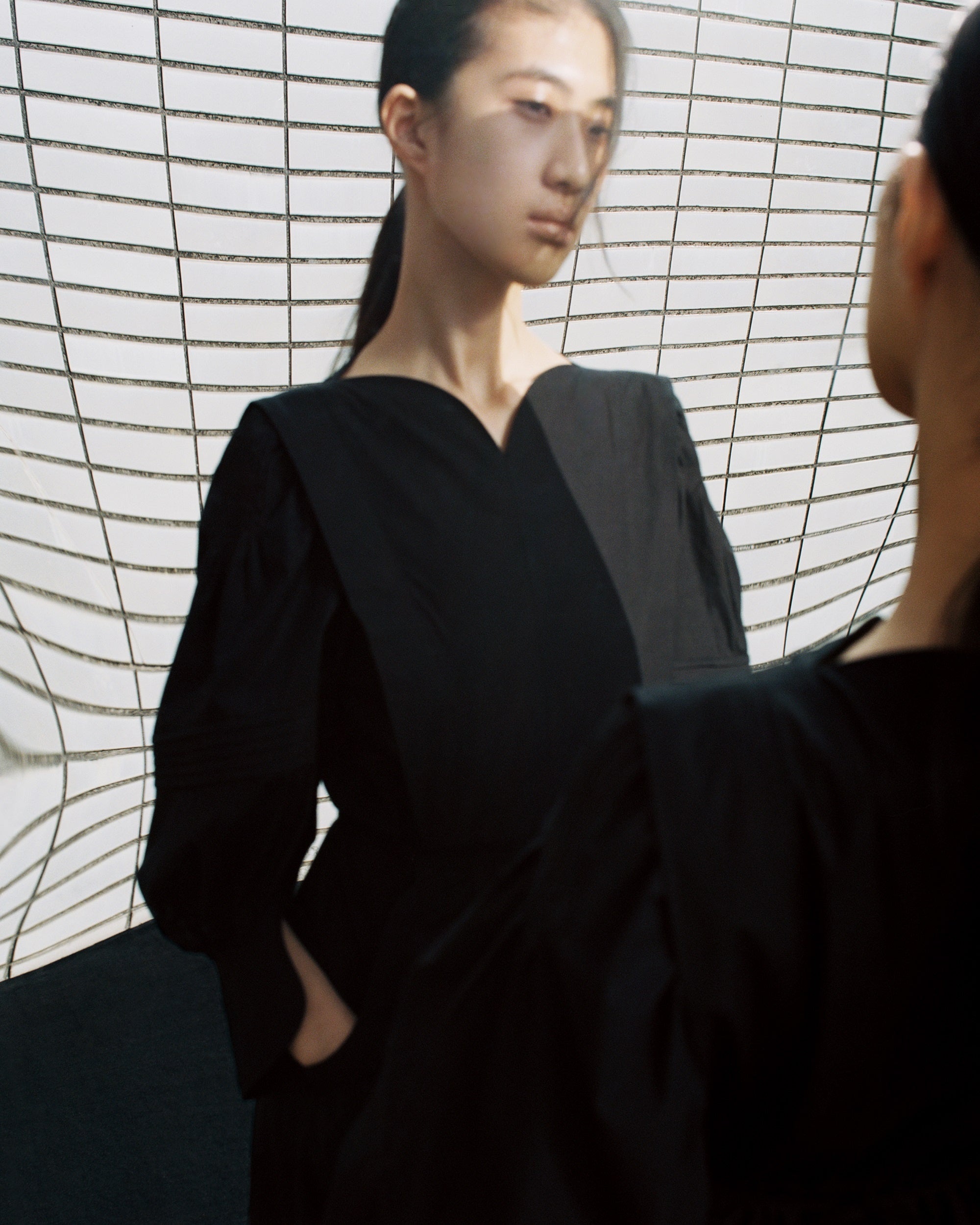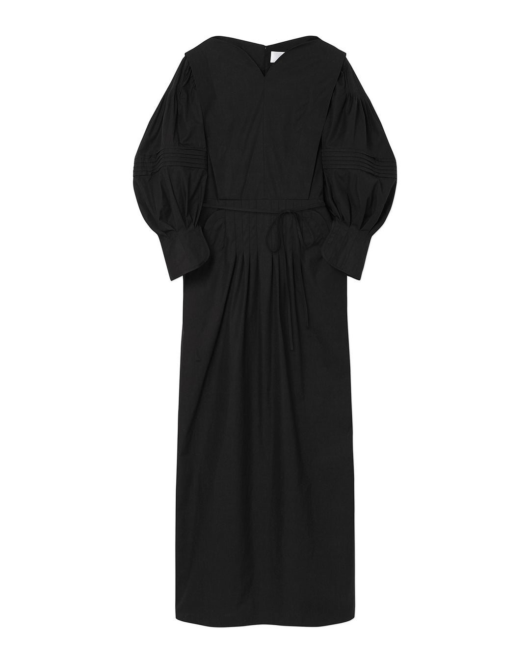 デコルテと手首は華奢に見えるよう曲線のカッティングを施し、タックの入ったボリュームのあるアームが立体的なシルエットを際立たせるドレス。伊勢丹新宿店限定として日常使いしやすい無地のブラックカラーが登場します。コットン100%の生地は肌馴染みもよく、春の訪れを待ち遠しくさせる1着です。