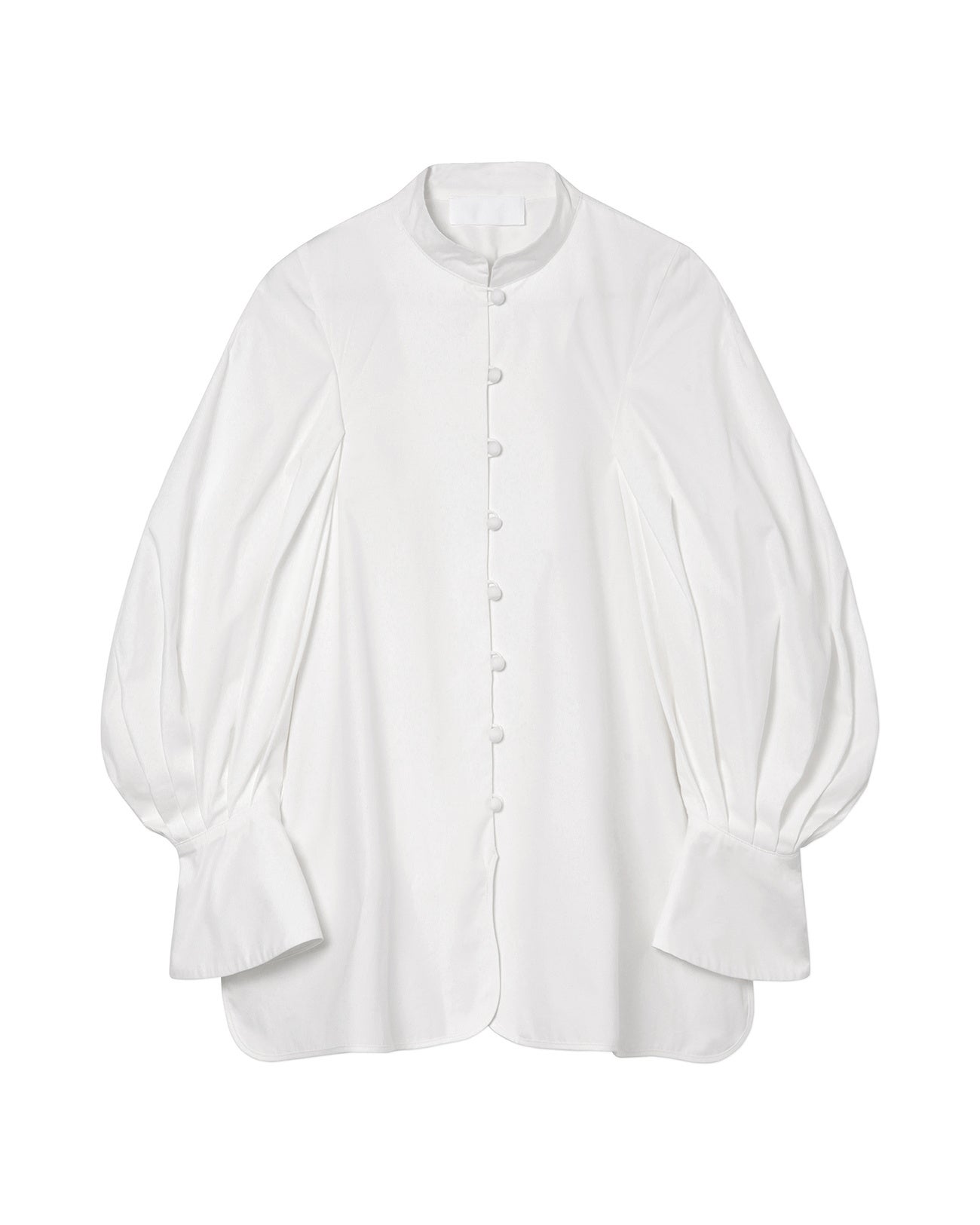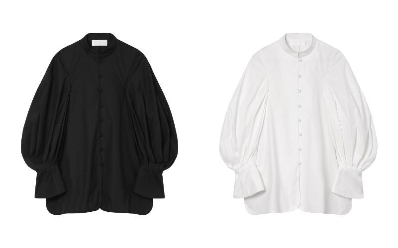 ゆとりのある身頃とやや長めの着丈でリラクシングなムードのブラウス。こちらも肌馴染みのよいコットン100%の生地で、着心地と美しさを両立。伊勢丹新宿店限定の無地のホワイト・ブラックカラーは、シンプルながらもたっぷりとしたボリュームのある袖やカフスの長さ、ボタンのディティールなどにマメらしさが感じられ、何気ない装いもエレガントにアップデートしてくれます。