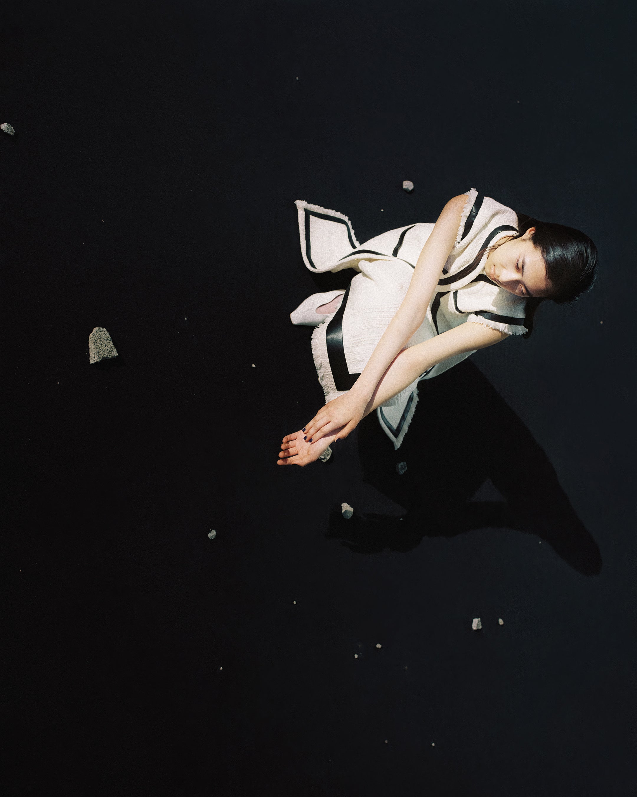 白く染まる冷たい大地に静かにたたずむ丹頂鶴の佇まいが着想源の2023 Pre Spring Collection。鶴のような繊細さと凛とした強さという相反する要素を共存させ、モノトーンをキーパレットにした本コレクションは、<Mame Kurogouchi>が考える現代におけるクラシックスタイルの再定義を提案しています。