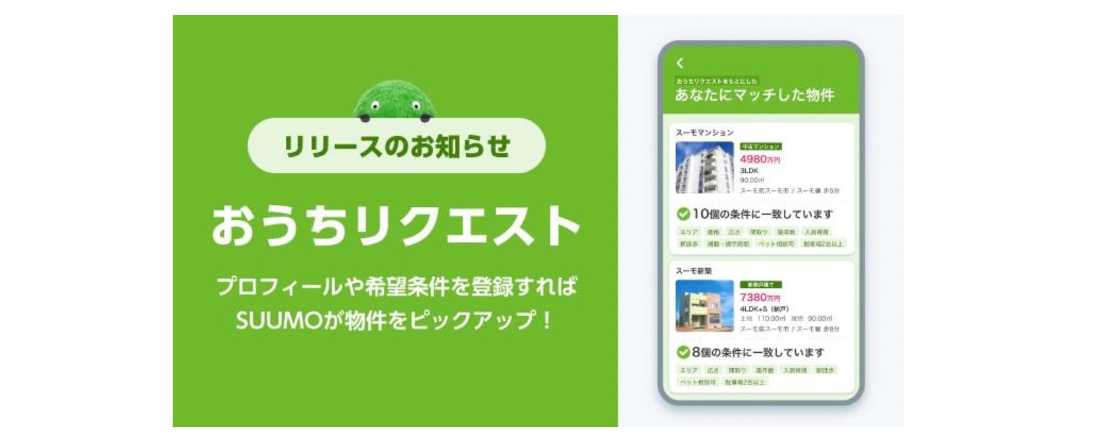 こうした状況から、『SUUMO』ではユーザーの希望条件に合う物件の提案や、物件探しの負担を軽減するサービスのニーズが高いと考え、本日2024年2月14日、新築・中古一戸建てや中古マンション、土地探しにおける『おうちリクエスト機能』のリリースに至りました。