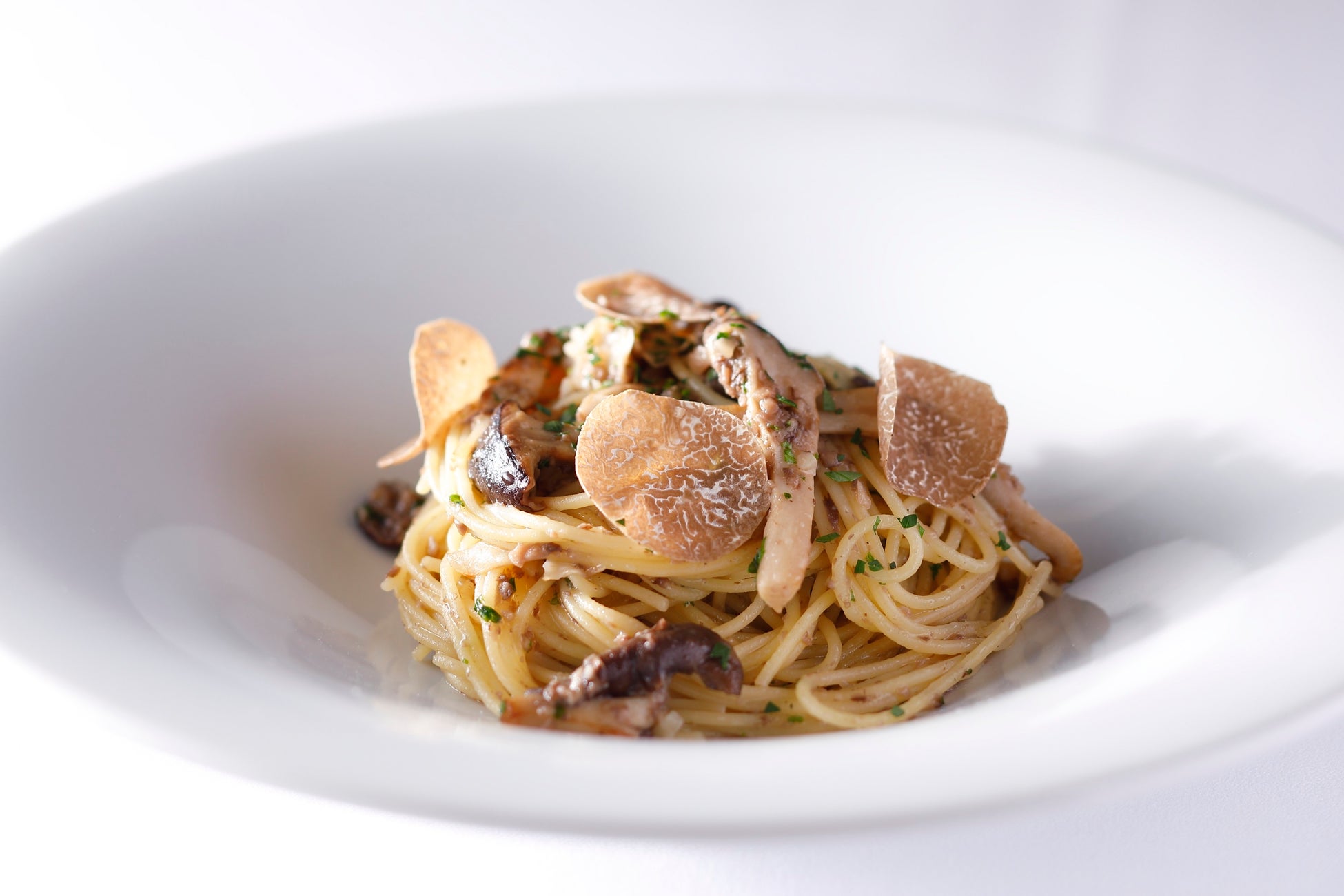 花びら茸、霜ふり平茸、柳松茸、丹波しめじの4種の茸を使用した“茸づくし”の一皿。ブラウンマッシュルームのラグーソースとパスタのハーモニーに“食欲の秋”にふさわしいパスタをご用意いたしました。※ディナーコースでは、特別に秋トリュフを添えて提供します。