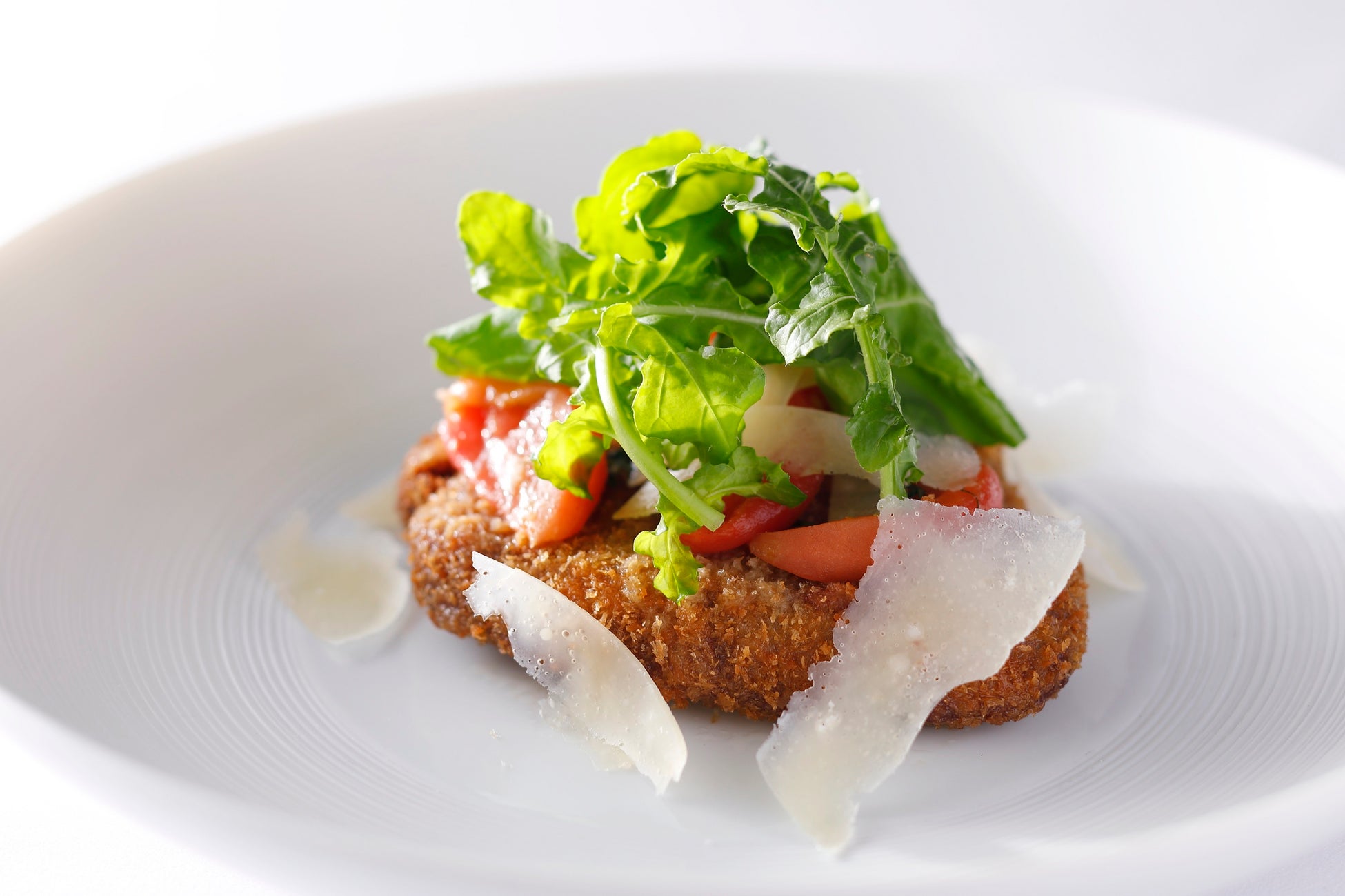 人気の洋食メニューのひとつであるカツレツは、和牛フィレ肉を使用。厚めにカットし、食べ応え抜群の一品に。濃厚なアメーラトマトのケッカソースと、ルッコラセルバチコのサラダを合わせ、パルメザンチーズをスライス。王道にして洗練された味に仕上げました。