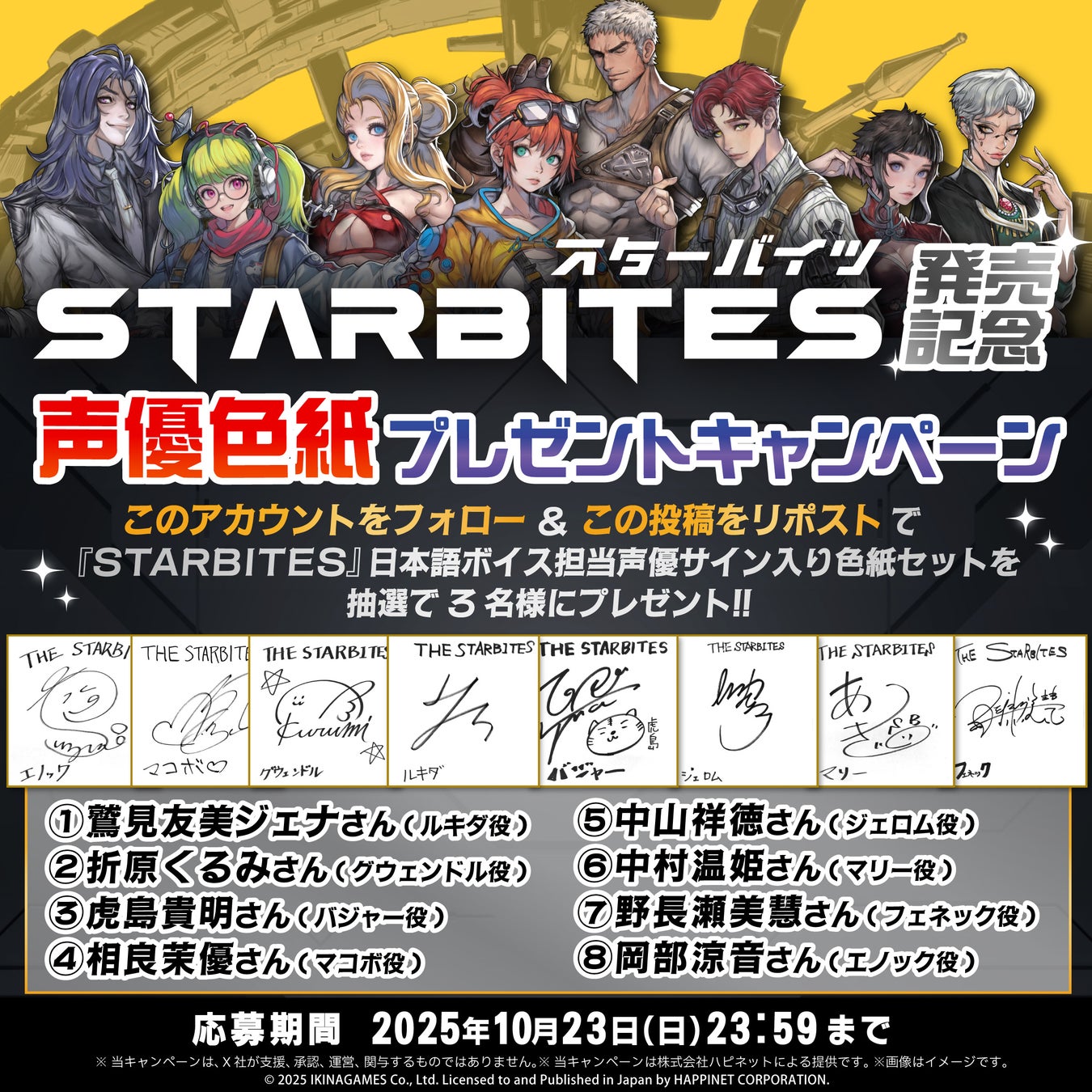 パッケージ・ダウンロード版の発売に合わせて、「Happinet GAMES / Happinet Indie Collection 公式X」では、『STARBITES』を彩るキャラクターのボイスを担当して頂いた声優陣の直筆サインが当たるキャンペーンを開催します。