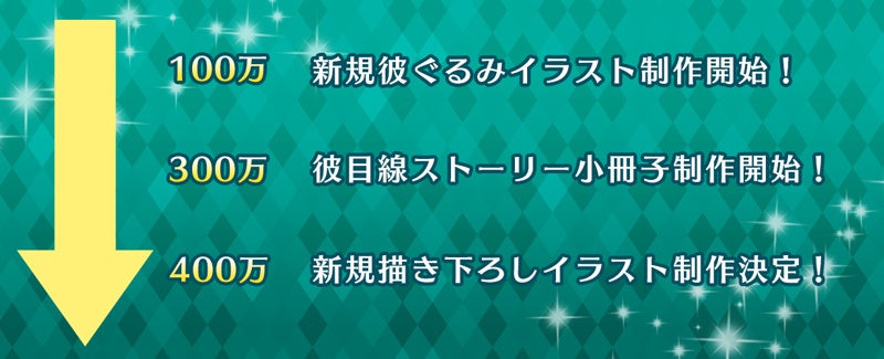2023年8月24日(木)からスタートした本プロジェクトでは、目標金額の達成によって、「新規彼ぐるみイラスト制作」「彼目線ストーリー小冊子制作」「新規描き下ろしイラスト制作」などが予定されています。