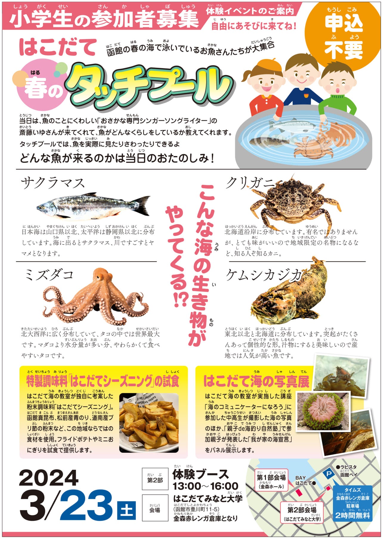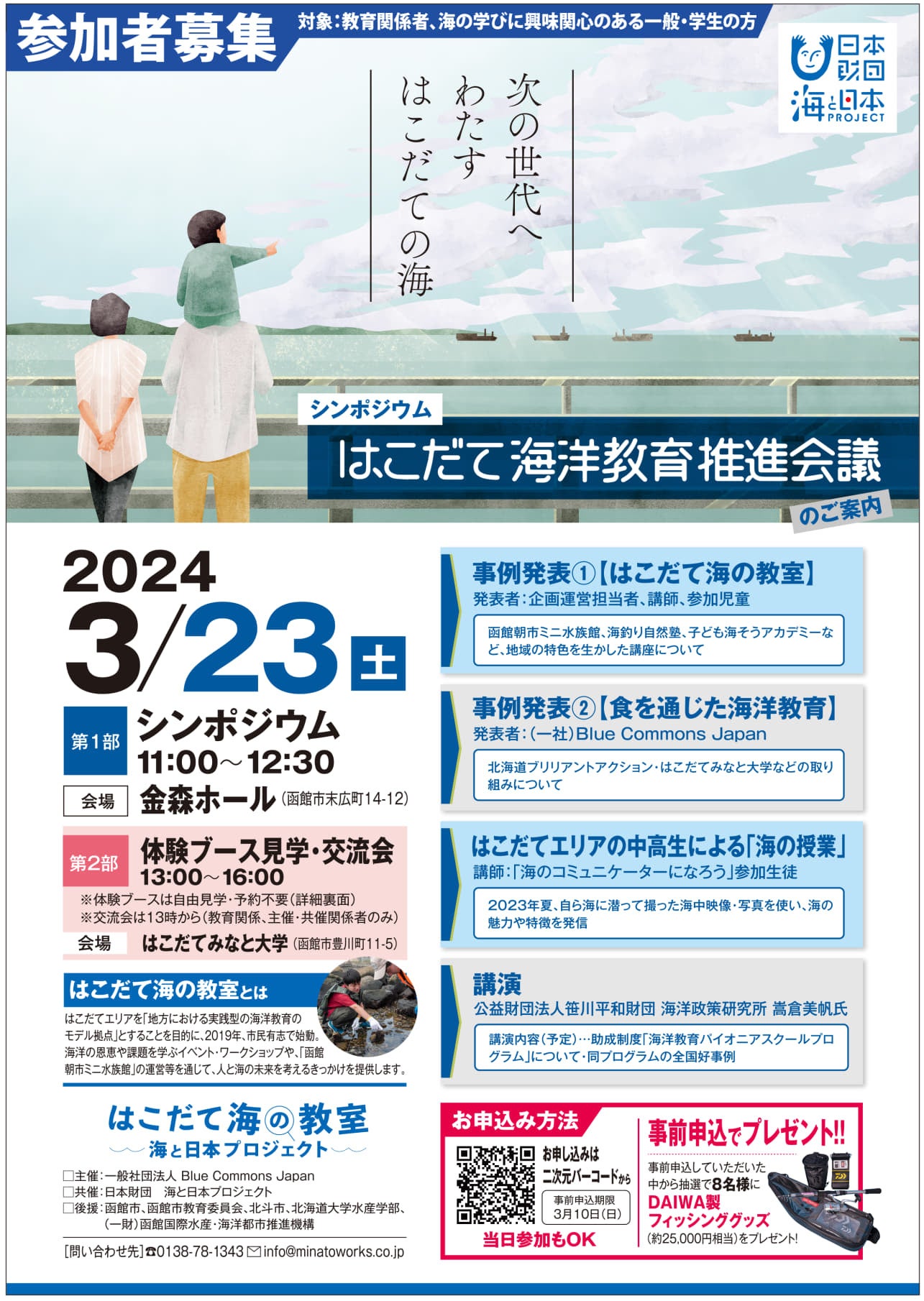 プログラム | 1.事例発表「はこだて海の教室」 函館朝市ミニ水族館、海釣り自然塾、子ども海そうアカデミーなど、地域の特色を生かした講座について 2.事例発表「食を通じた海洋教育」 北海道ブリリアントアクション、はこだてみなと大学などの取り組みについて 3.はこだてエリアの中高生による「海の授業」 はこだて海の教室の講座「海のコミュニケーターになろう」に参加した中高生が自ら海に潜って撮った海中映像・写真を使い、海の魅力や特徴をプレゼン 4.講演(公益財団法人笹川平和財団 海洋政策研究所 嵩倉美帆氏) 助成制度「海洋教育パイオニアスクールプログラム」の説明、および同プログラムを活用した全国の好事例について(予定) |