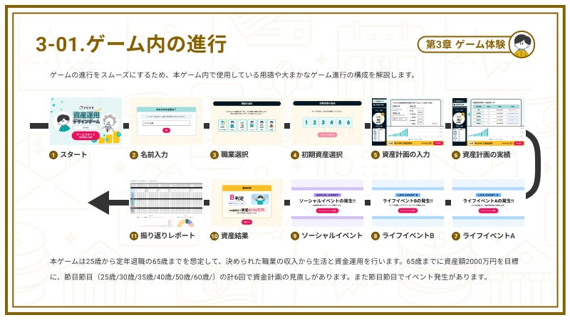 それぞれの職業における収入や貯蓄割合、資産運用の計画、保険加入の有無などを検討し、年代ごとに様々なライフイベントやソーシャルイベントを迎えながら、生涯の資産形成をゲーム感覚で学ぶことができます。