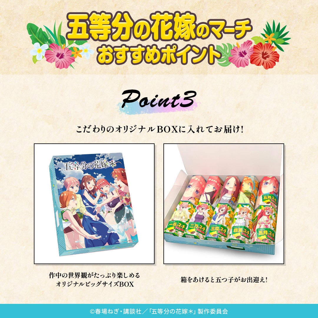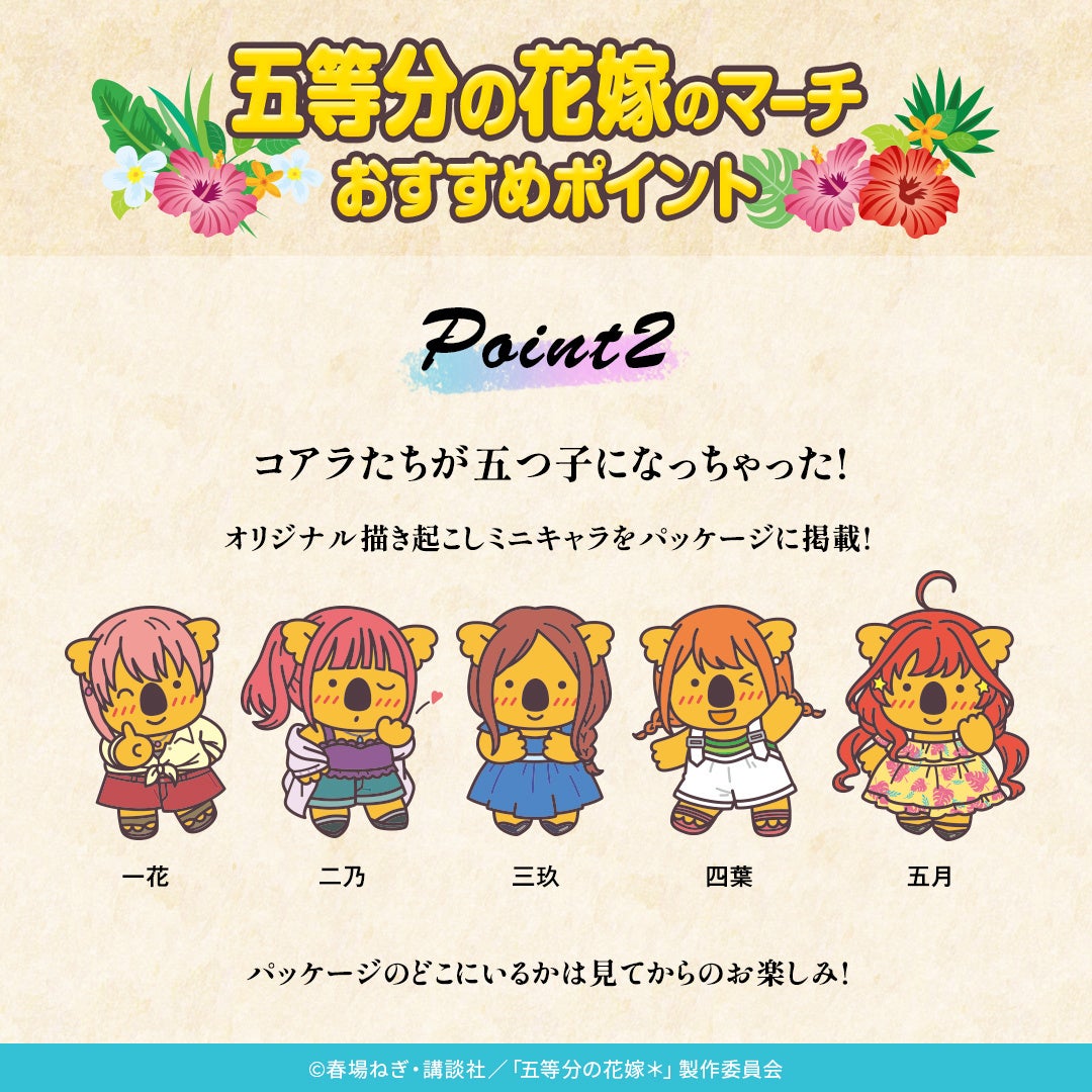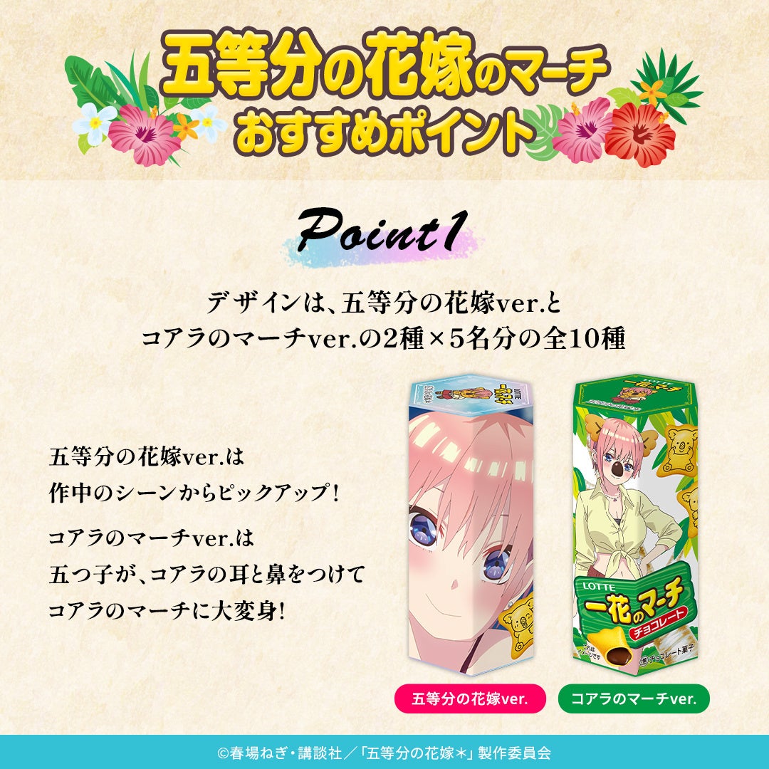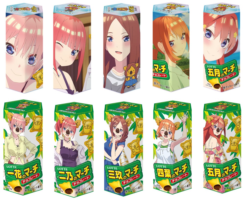 株式会社ロッテは3月11日(火)正午に、ロッテオンラインショップ限定で「オリジナルコアラのマーチ」シリーズから、「五等分の花嫁のマーチ」を販売します。TVスペシャルアニメ『五等分の花嫁*』のキャラクターが、大人気チョコ菓子のコアラのマーチに大変身して発売します。ロッテオンラインショップにて、期間限定で数量限定販売となります。ぜひご覧ください!