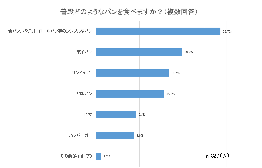 「シンプルなパンを食べる人」が約3割と最も多く、そのほとんどは同居者がいる人(87%)でした。パンを食べる頻度が少ない人でも、昼食に月に数回「サンドイッチ」を食べているという回答も。他、最近手に入りやすくなったグルテンフリーや低糖質のパンを食べるという人もいた。