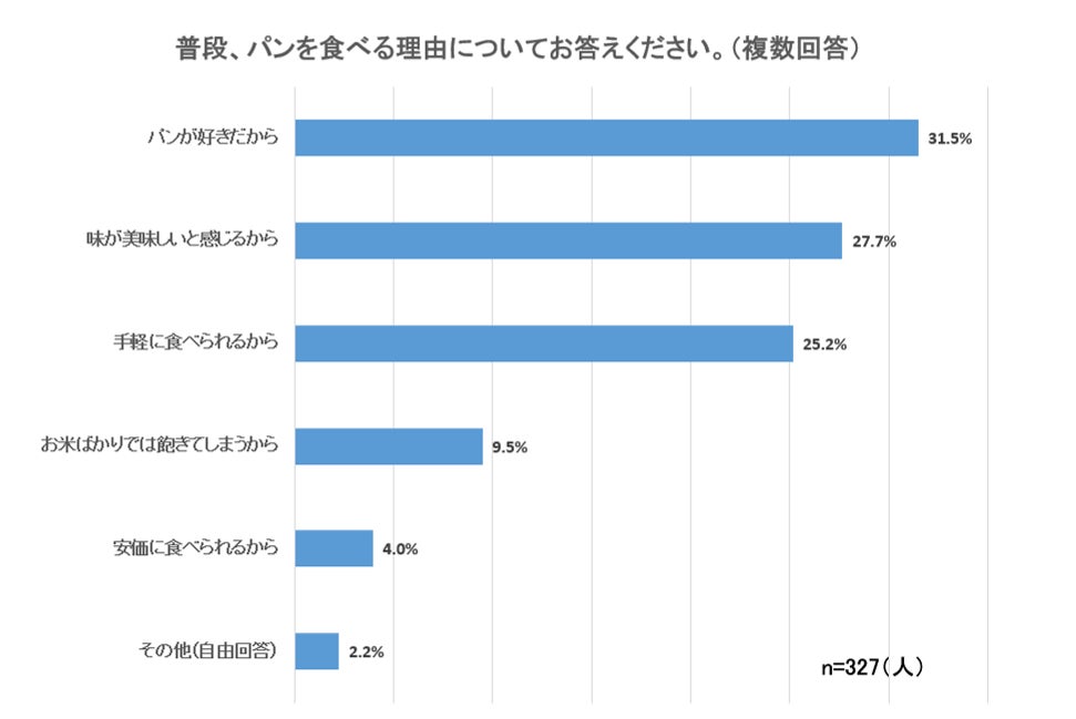 「お米ばかりでは飽きてしまうから」という回答は1割にとどまり、単純にパンが好きで食べている人が多い。自由回答からは「味や食感のバリエーションが豊富で食べ飽きない」「すきなパン屋の新作を食べたい」ほか、「持ち運びやすい」という意見も。