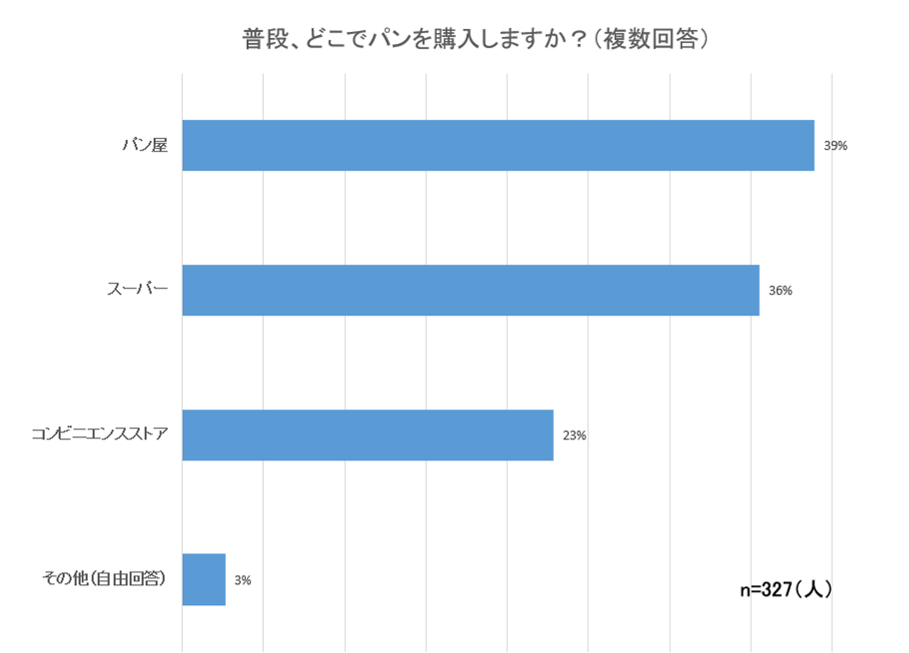 1位「パン屋」(39%)、2位「スーパー」(36%)がトップ2で、「コンビニエンスストア」(23%)と続く。食品を取り扱っている「ドラッグストア」で購入する人も。