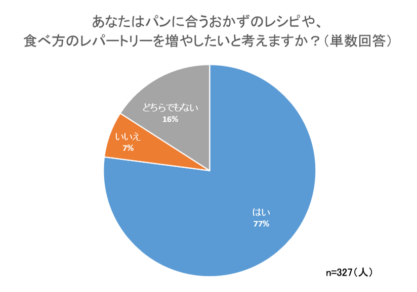 77%の人が「はい」と回答、パンに合わせるおかずのレシピや食べ方のレパートリーを増やしたいと思っていることが分かった。レパートリーが増えれば、食卓にパンが登場することが多くなりそうだ。