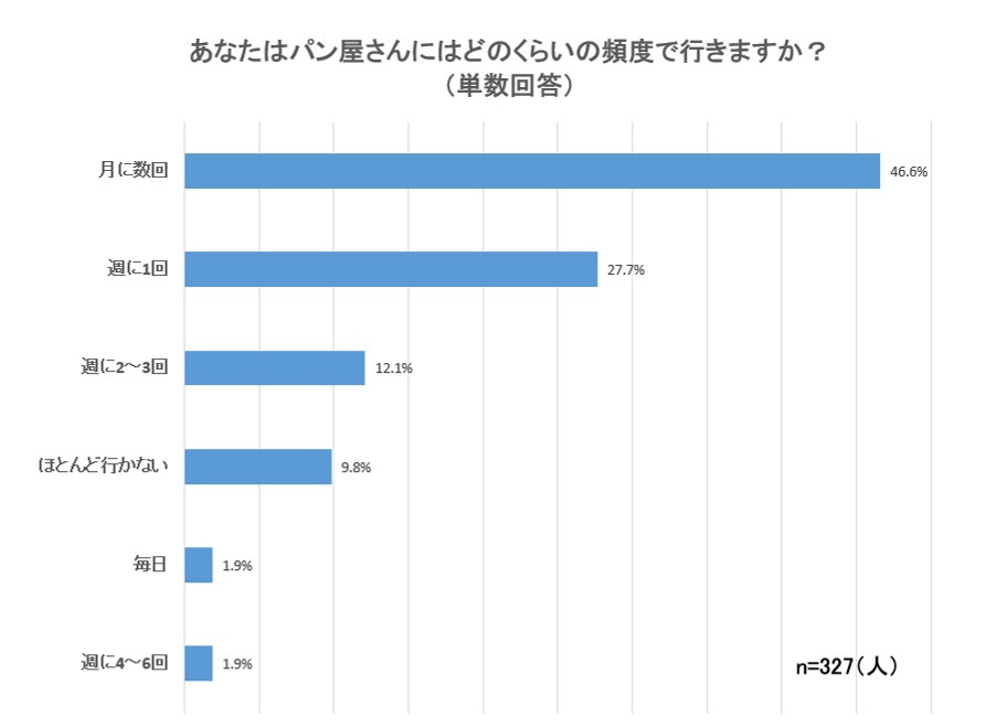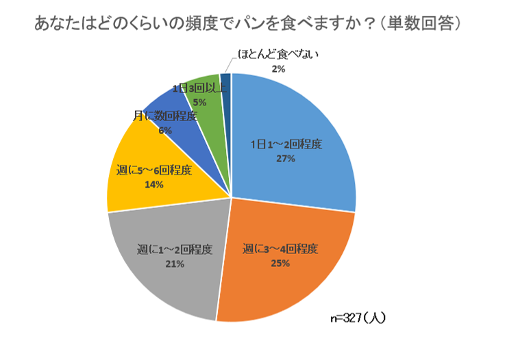 ◆「1日1~2回程度」(27%)「週に5~6回」(14%)「1日に3回以上」(5%)と合わせると46%で、約半数の人がほぼ毎日パンを食べている。