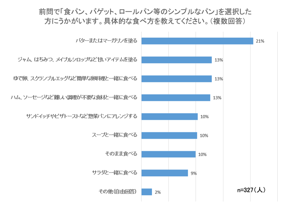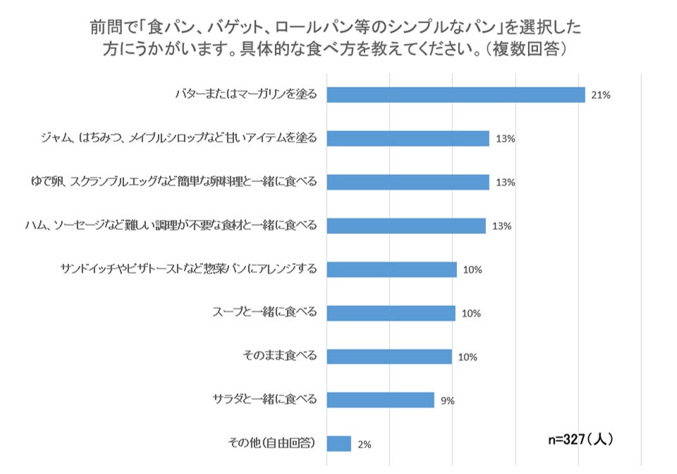 1位は「バターまたはマーガリンを塗る」(21%)で、シンプルなパンは、スプレッド系か簡単なおかずと合わせて食べる人が多数であることが分かった。